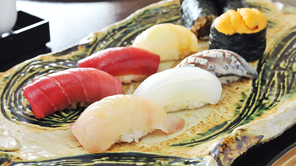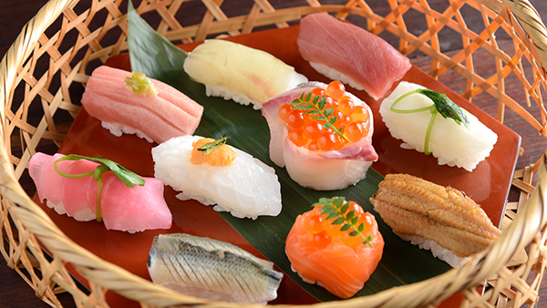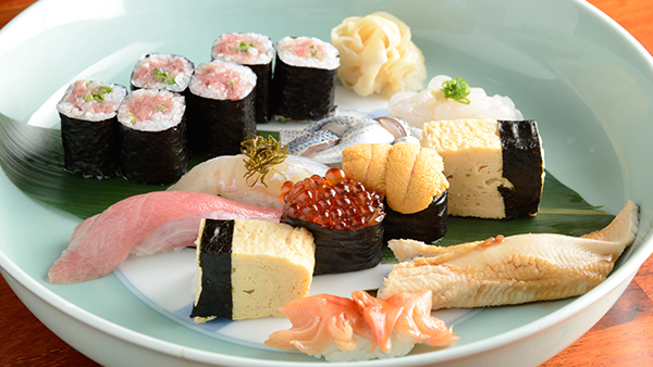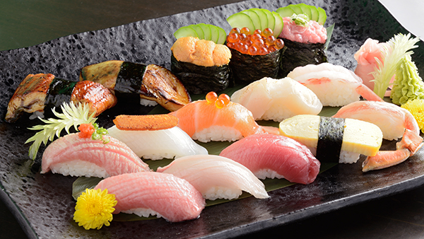 「魚を旨く食べると書いて鮨。魚の旨さを極限まで引き出すのが江戸前鮨です」。日本料理店の代表格「日本亭」で板長を務める見崎さんは、17歳から数々の料亭で和食の技を磨き、銀座のミシュラン認定店「鮨とかみ」で修行した実力派。寿司に対する愛情は人一倍、とくに仕事の8割を費やすという仕込みは、一番美味しい状態で客の喉を通る瞬間から逆算して拵えます。たとえばキスは、寿司だねの表を酢じめ、裏は昆布じめに。マグロは一週間低温熟成させ、塊の中心だけを使う手の凝りよう。