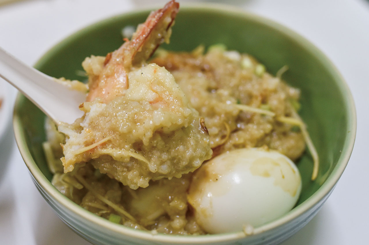 水分を飛ばした粥ジョーク・ヘーン(400B)も人気の一品。日によって鮑など高級食材も扱う