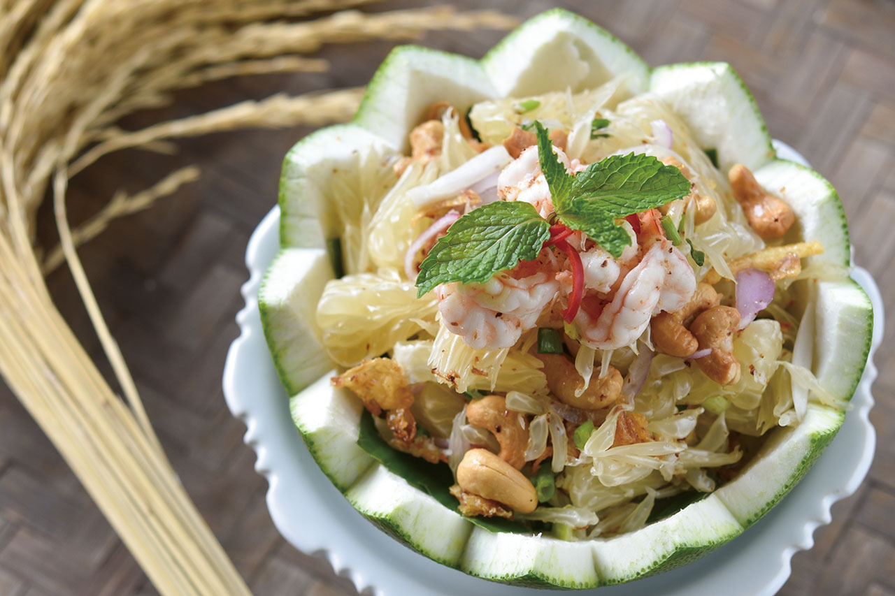 ザボンの飾り切りがかわいらしいヤム・ソムオー(250B)は、酸・甘・辛が調和したまろやかな味わい