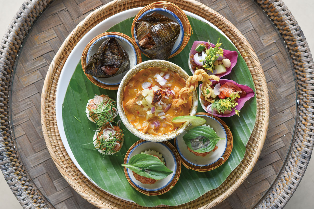 カオソーイ(カレー麺)や蓮の花びらを使ったおつまみなどを盛り合せた前菜セット(250B)