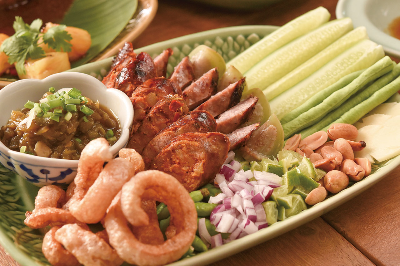 イサーン(タイ東北)地方とチェンマイのソーセージ盛合せ(280B)は、唐辛子のディップとともに