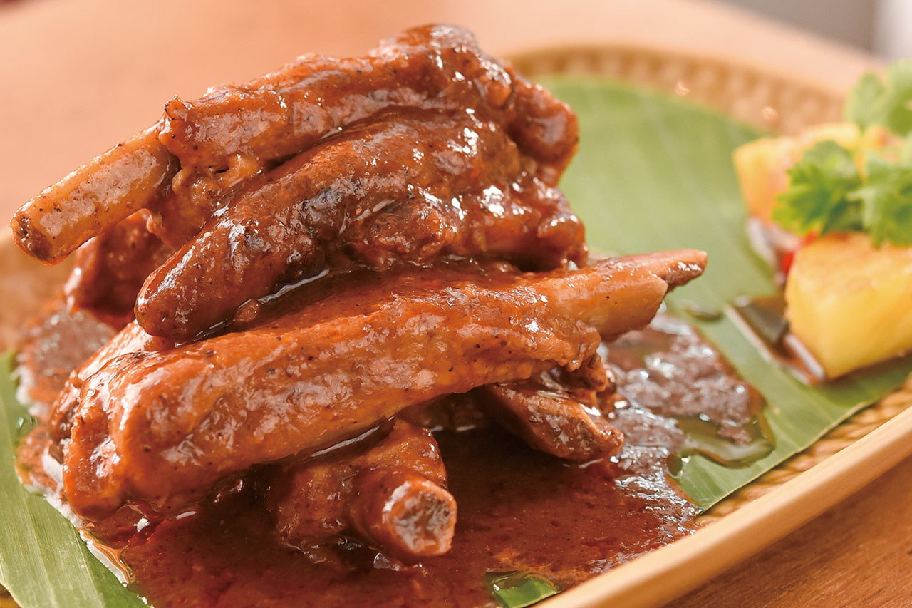 ポークリブの煮込み(280B)は、甘酸っぱいタマリンドを加えた濃厚なバーベキューソースで