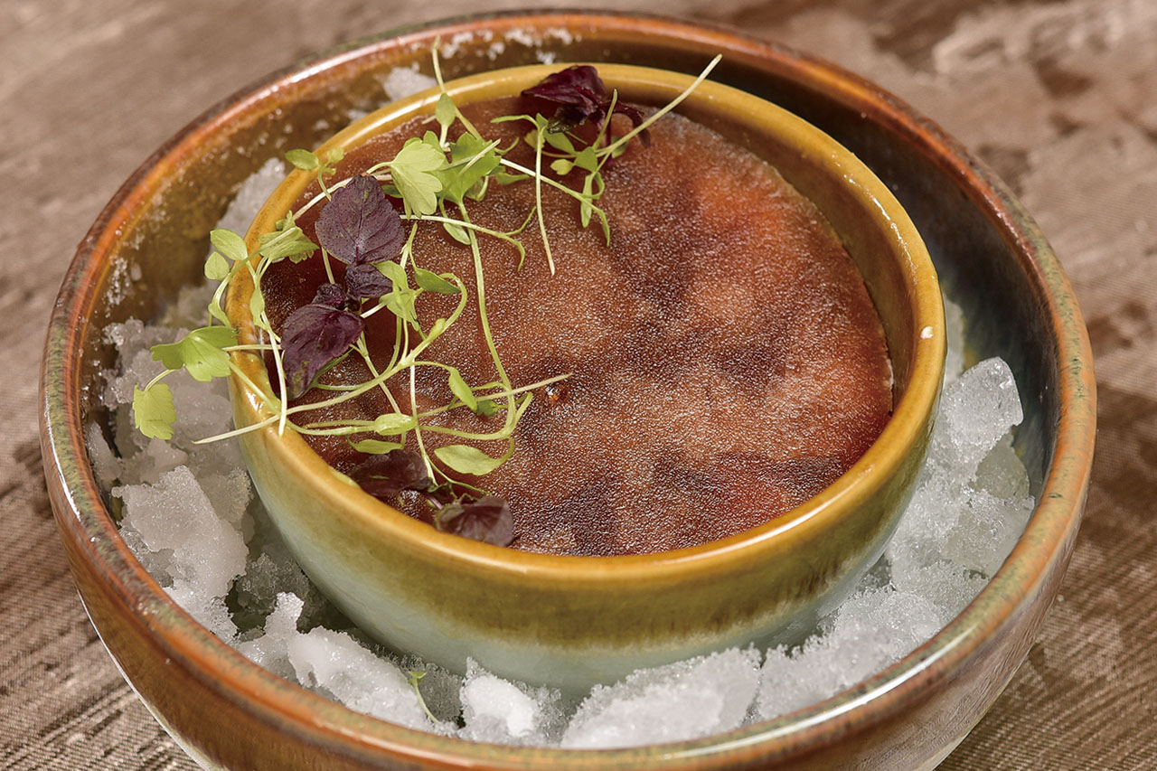氷で覆われた鮪のタルタル。ソースには醤油とみりんが使われており和のテイストが感じられる