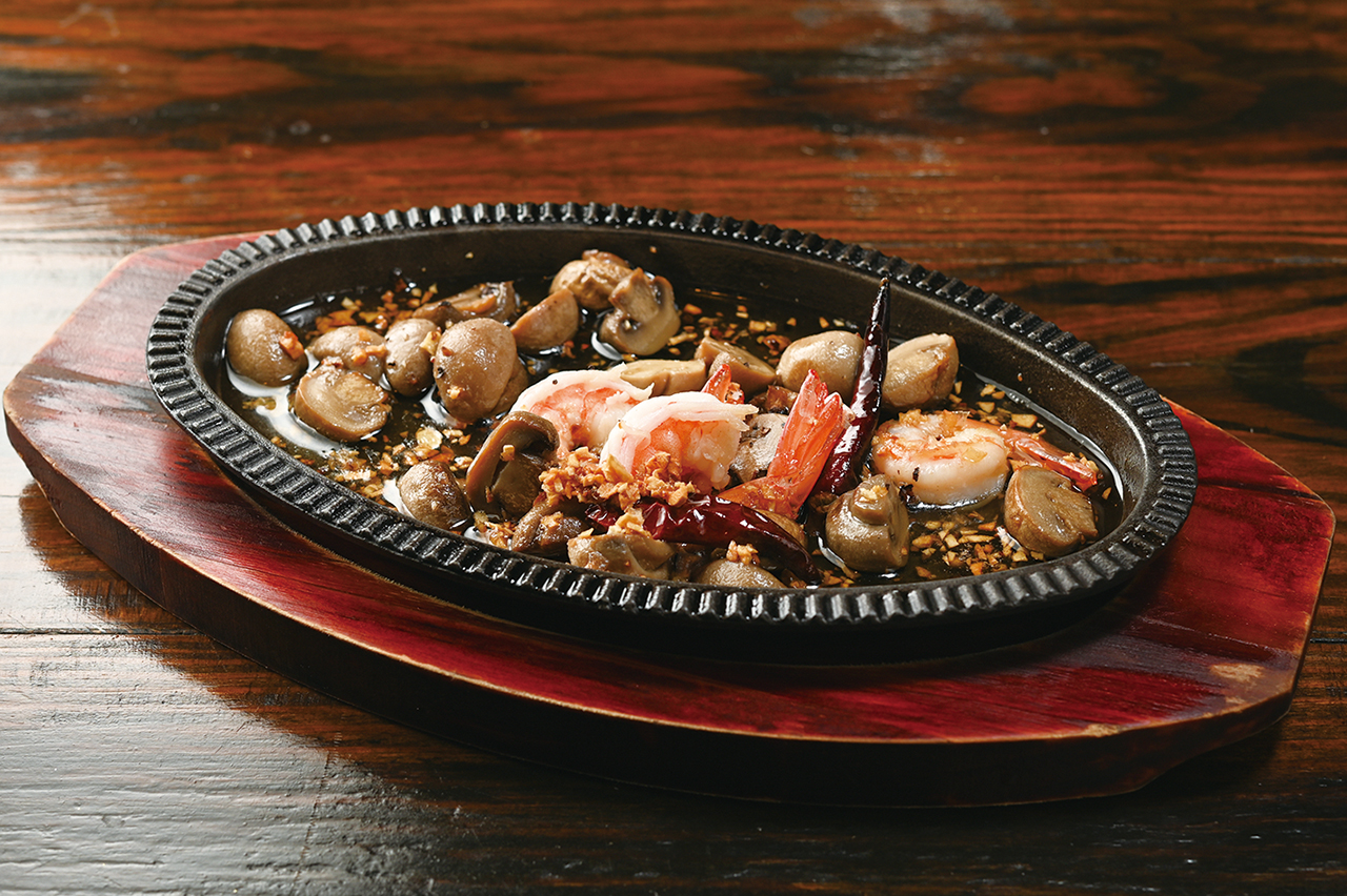 大人気メニューの海老のアヒージョ(80B)。マッシュルームとにんにくの香りが溶けだしたオイルはバ