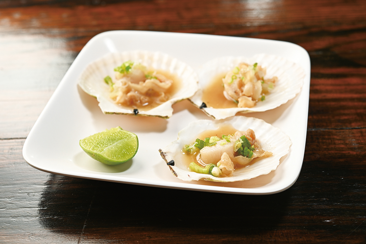 北海道産ホタテ、宮城県産ほっき貝など、魚介も良いものが揃う(写真は4点盛り320B)