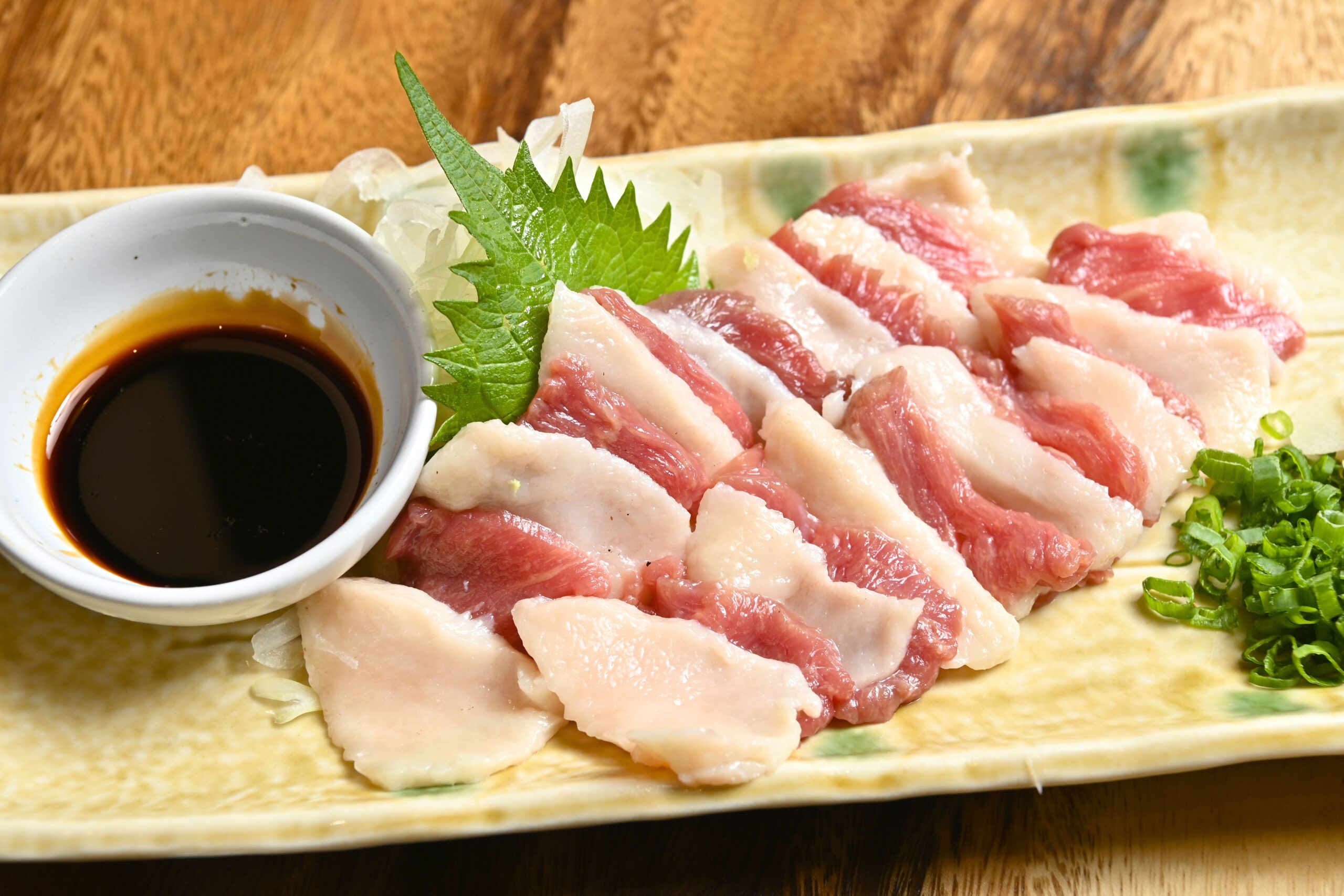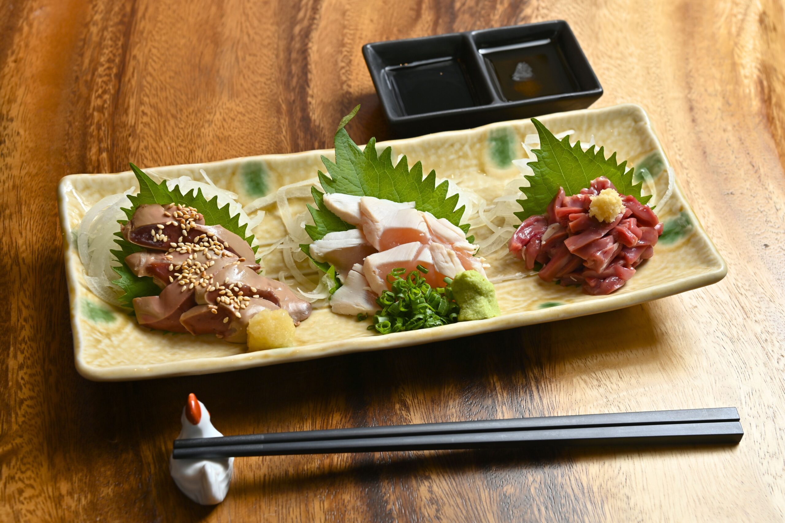 レバー、ささみ、ハツと人気の部位を少しずつ味わう鶏刺し3種盛り