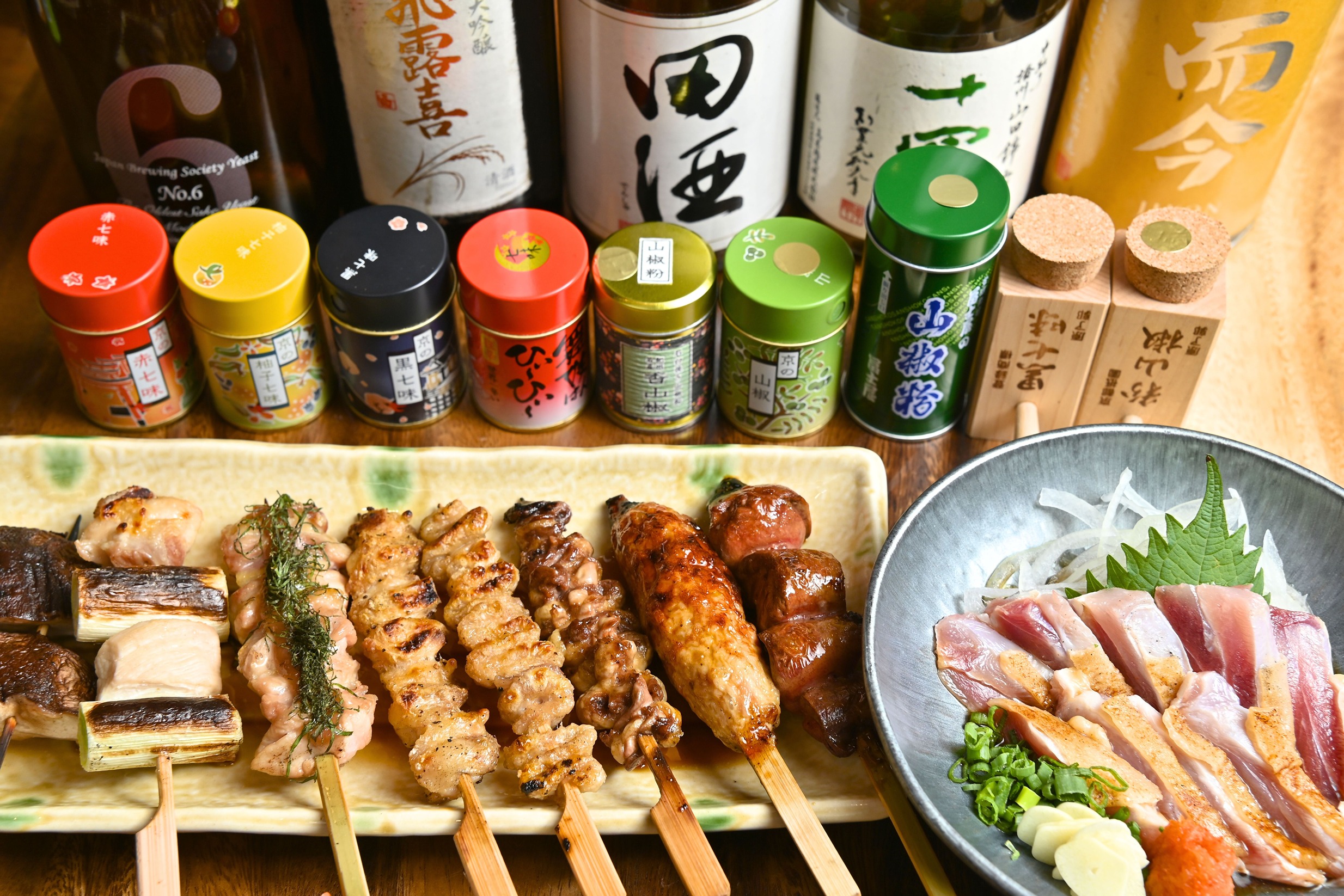 日本産地鶏の焼鳥に合わせる調味料にもこだわり、天日塩や大分産醤油、選べるレアな七味や山椒が料理を引き立てる