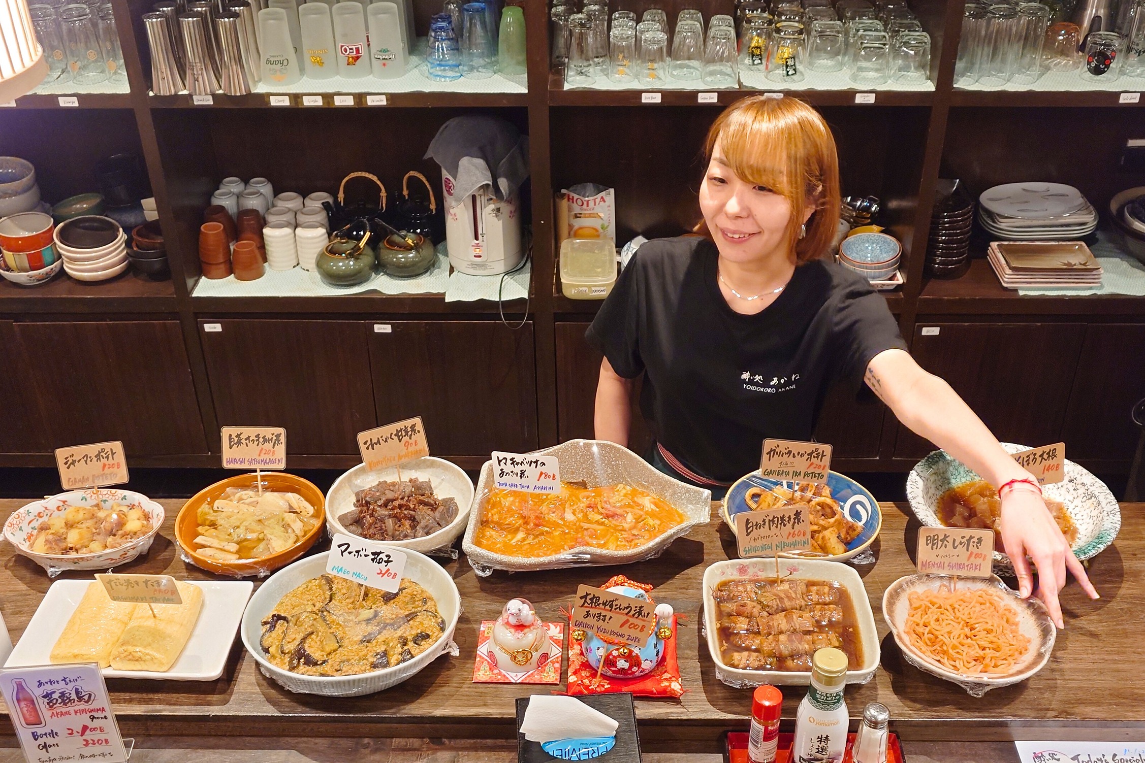 元気な女将と味わうおふくろの味 暖簾をくぐると元気な声で迎えてくれる、元「鮨郷土居酒屋三陸」の看板娘・あかねさんが切り盛りする「酔い処あかね」。ここで楽しめるのは、種類豊富な酒と、日替わりのおばんざい。だし巻きたまご、こんにゃく甘辛煮、鶏しょうが団子、ポテサラを詰めたちくわなど、料理上手な母から受け継いだレシピを再現した懐かしいおふくろの味が揃う。お酒は、日本酒、焼酎、ワイン、梅酒などが豊富に揃い、世界各地のビールにも力を入れている。カウンター席ではあかねさんとの会話が楽しめるほか、2階には半個室が2部屋あり喫煙も可能。軽やかで丁度よい距離感の接客を提供するあかねさんの魅力に惹かれ、多くのファンが集うアットホームなお店だ。
