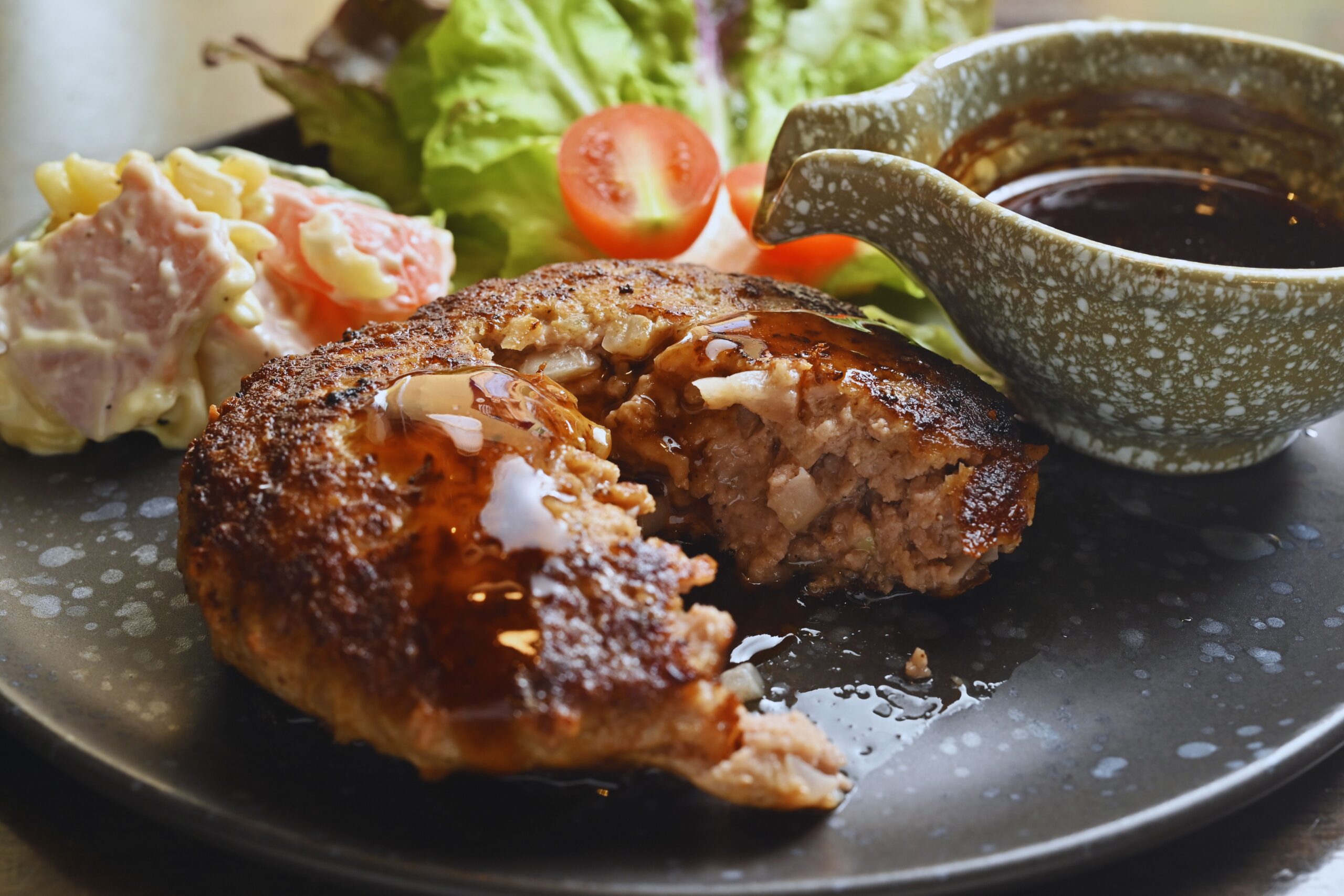 「母がいつもお皿いっぱい山盛りに作ってくれた大好きな味」という思い出の玉ねぎたっぷりハンバーグ(250B)