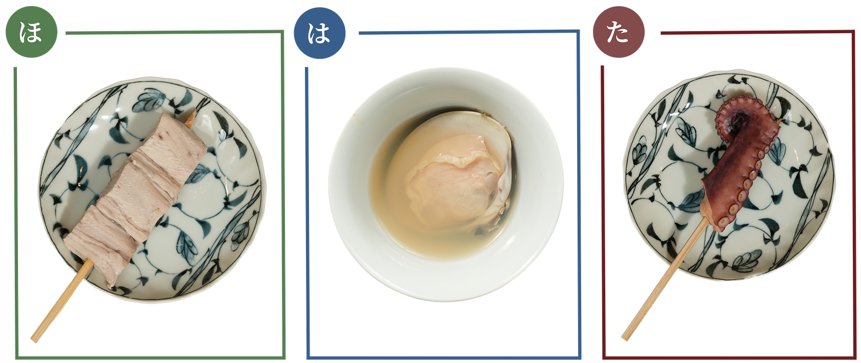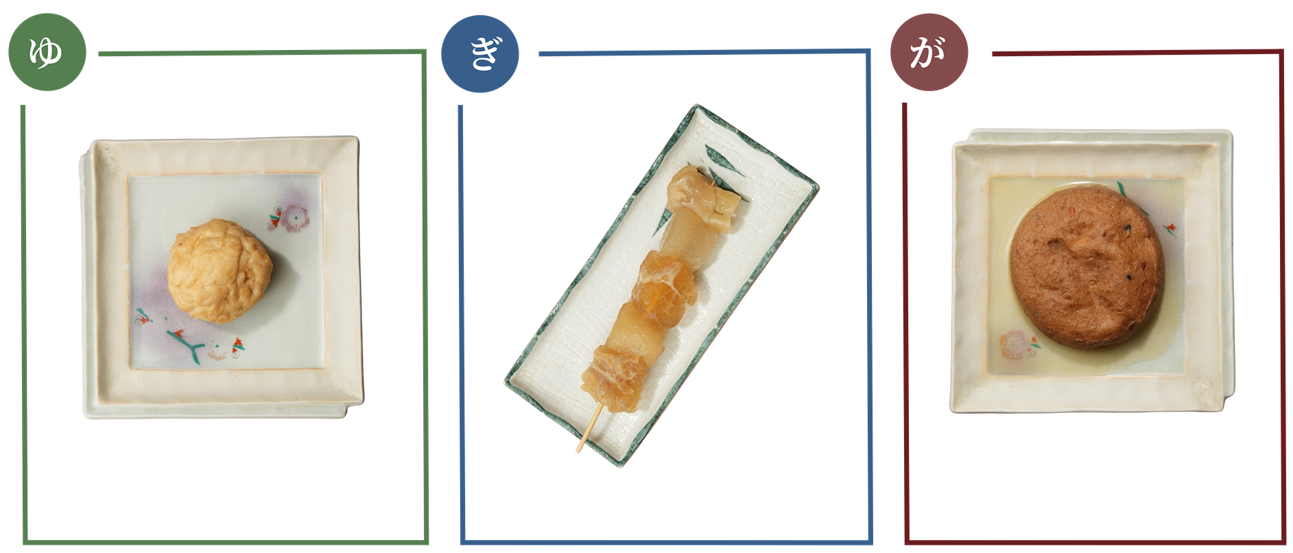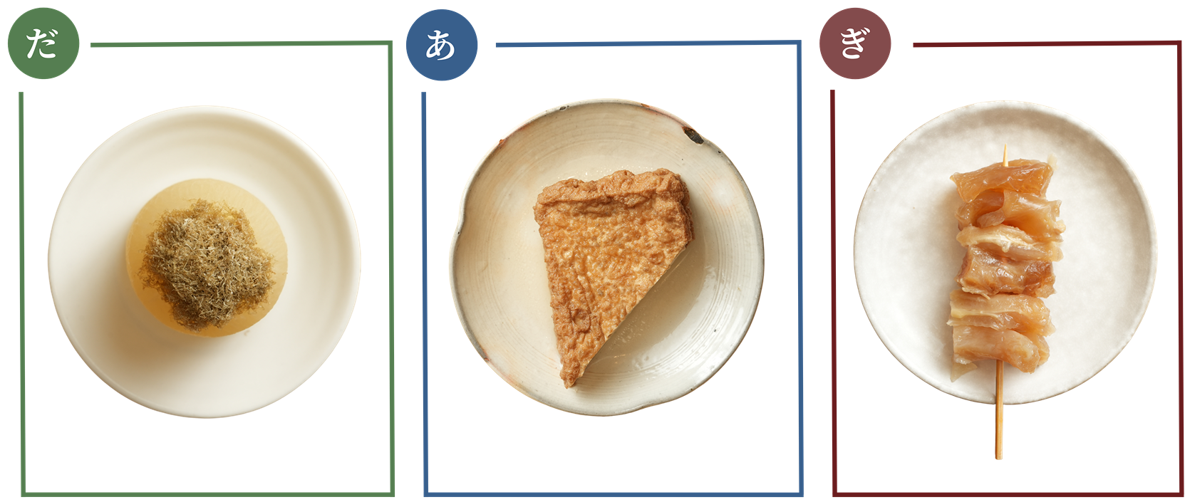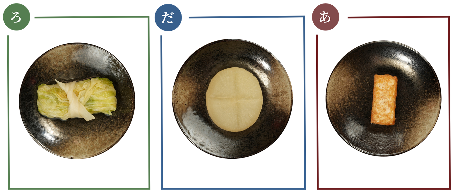 左/ロールキャベツ 60B: オーナーのお母様直伝のレシピで毎日手作りしている。真心こもった家庭の味に懐かしさを感じられる 中央/大根 50B: さっぱり仕上げたつゆでもしっかりと味が染み込むよう、オーナー自ら丁寧に隠し包丁を入れる 右/厚揚げ 60B: 外側からは豆の香りが立ち、中身はフワフワ食感になるよう丁寧に揚げている。揚げたてをつゆに入れる