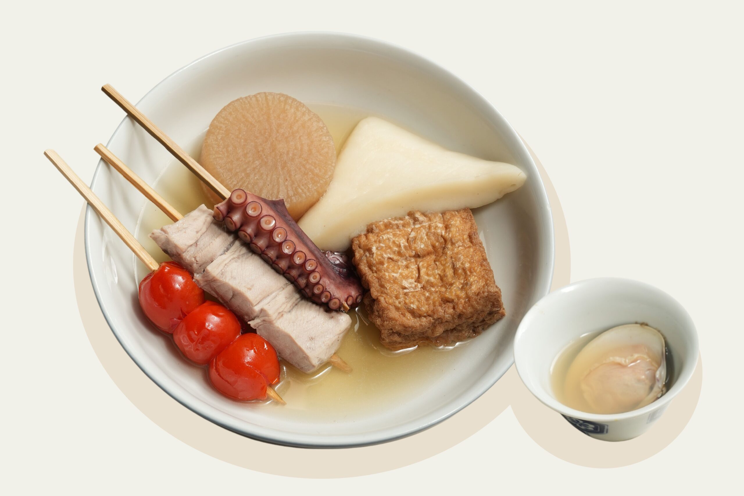 左/大根 50B: お米と一緒に煮て大根の灰汁や苦味を取るための下ゆでをしておくなど丁寧な下処理が際立つ 中央/厚揚げ 70B: バンコクに本店を持つ「卯の花」の自家製厚揚げを使用。香ばしく、大豆の風味が存在感を放つ 右/こんにゃく 50B: 小さめにカットされたこんにゃく。食感が良く、出汁がしっかりと染みていて噛むたび旨味が広がる