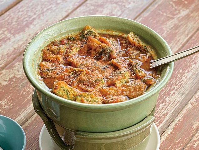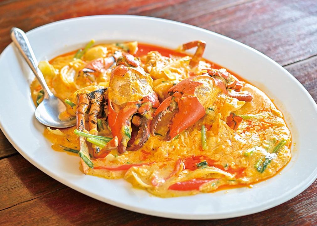 プーヌア・パッポンカリー(180B/100g 写真は1kg)スラータニー県から仕入れる大サイズの蟹を使用。ほんのり甘いふわふわ卵も絶品。香港から仕入れるカレー粉使用