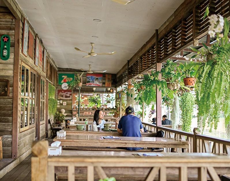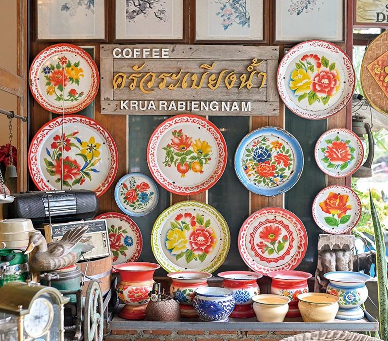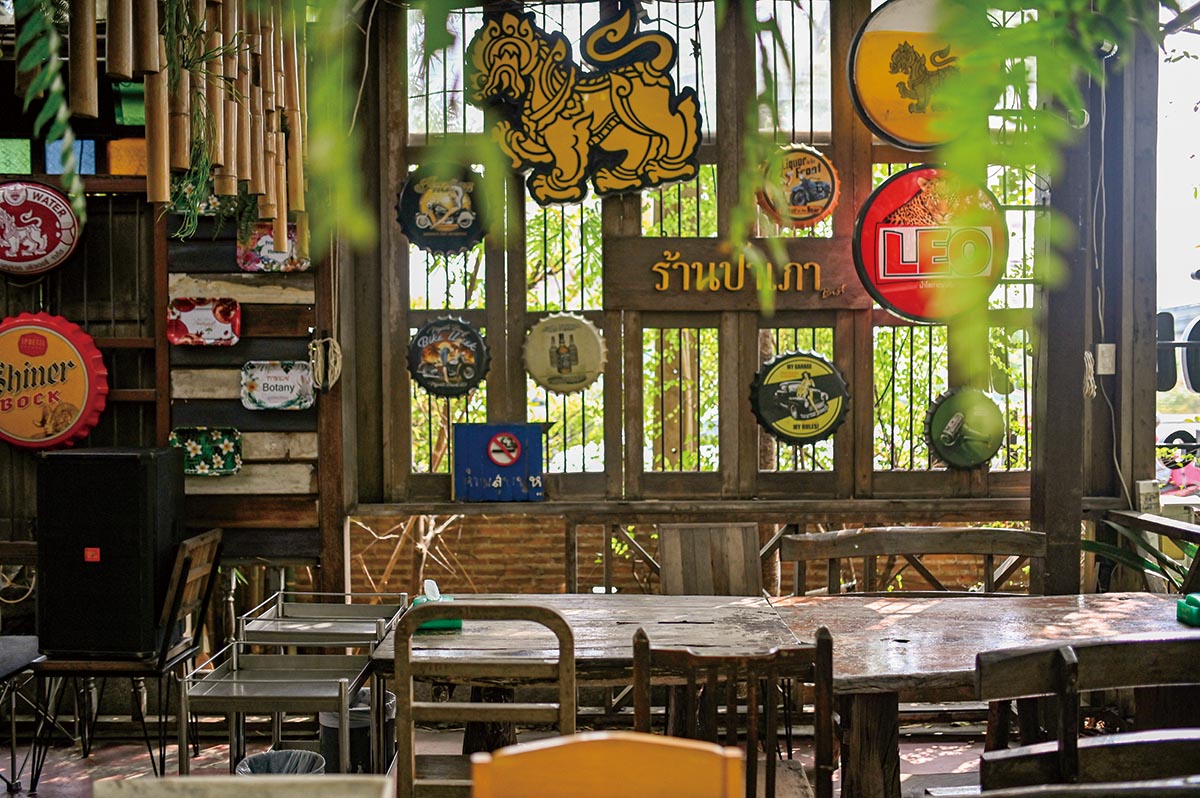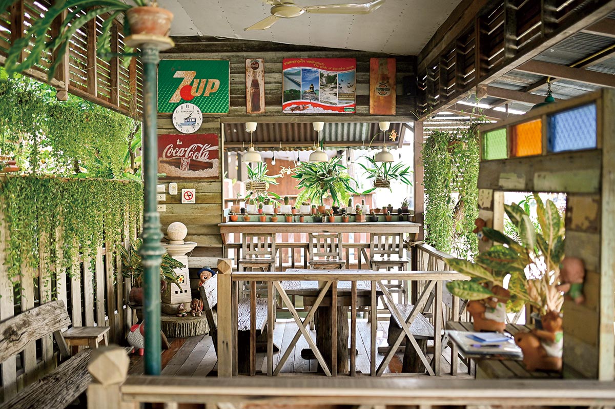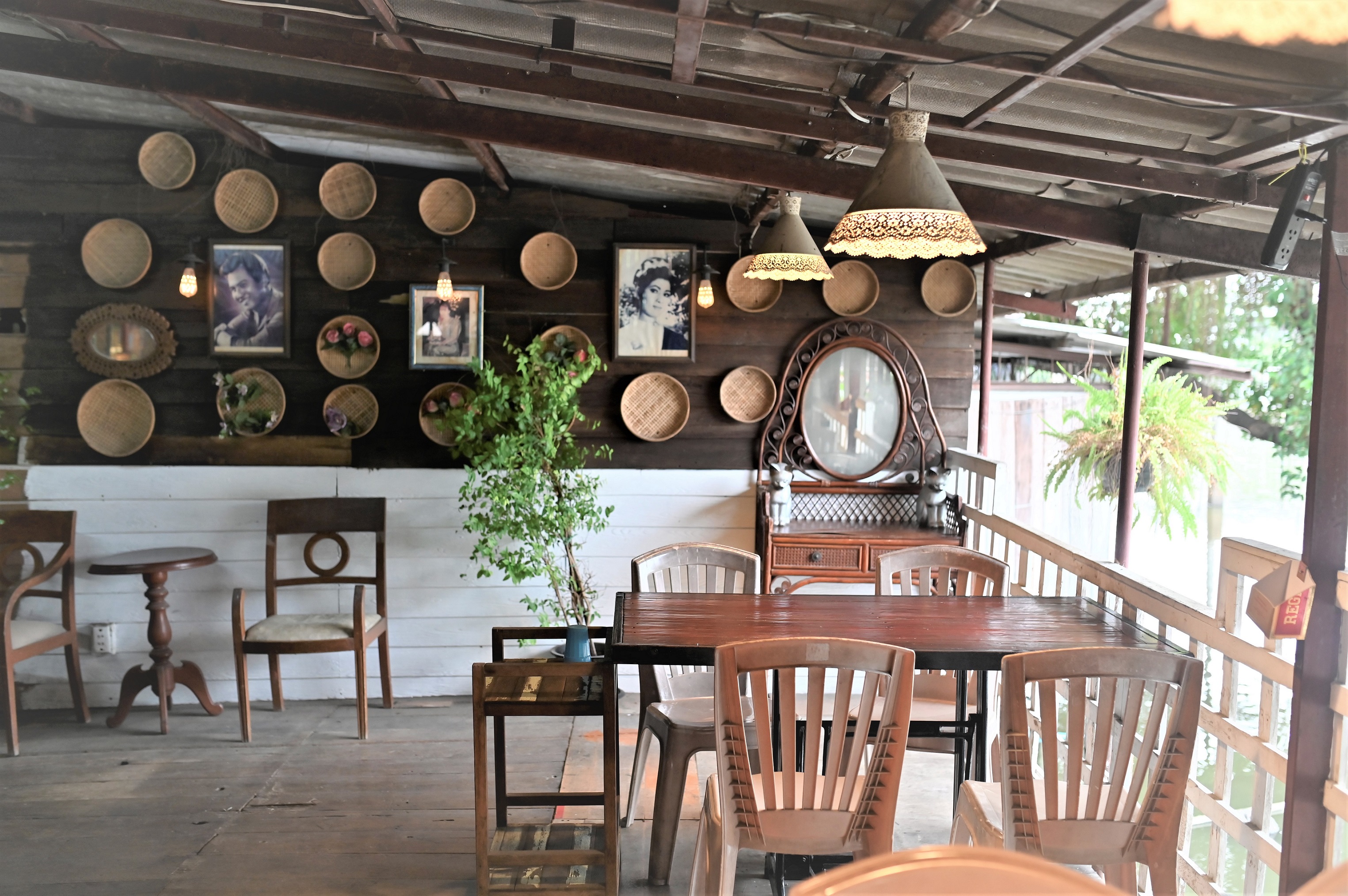 バンコクとチャチュンサオ県の間に流れる運河に面した店は、古き良きタイを感じられる素敵な佇まい。木造の店内には昔の本やグラス、ブリキのおもちゃなどがたくさん飾られています。