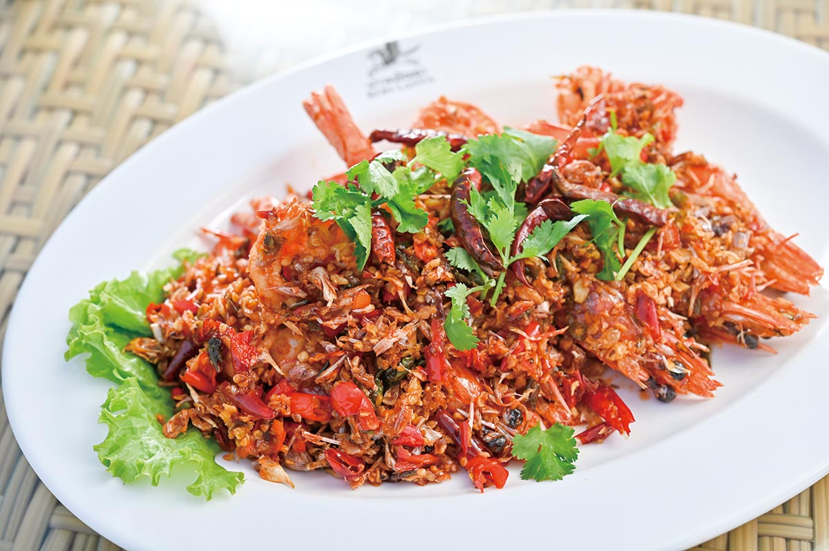 クンチェーブエイ・パットプリックグルア(左上:650B)新鮮な大振りな海老を皮ごとパリッと揚げた一品。一般的な中部料理やダチョウの肉を使った炒め物なども