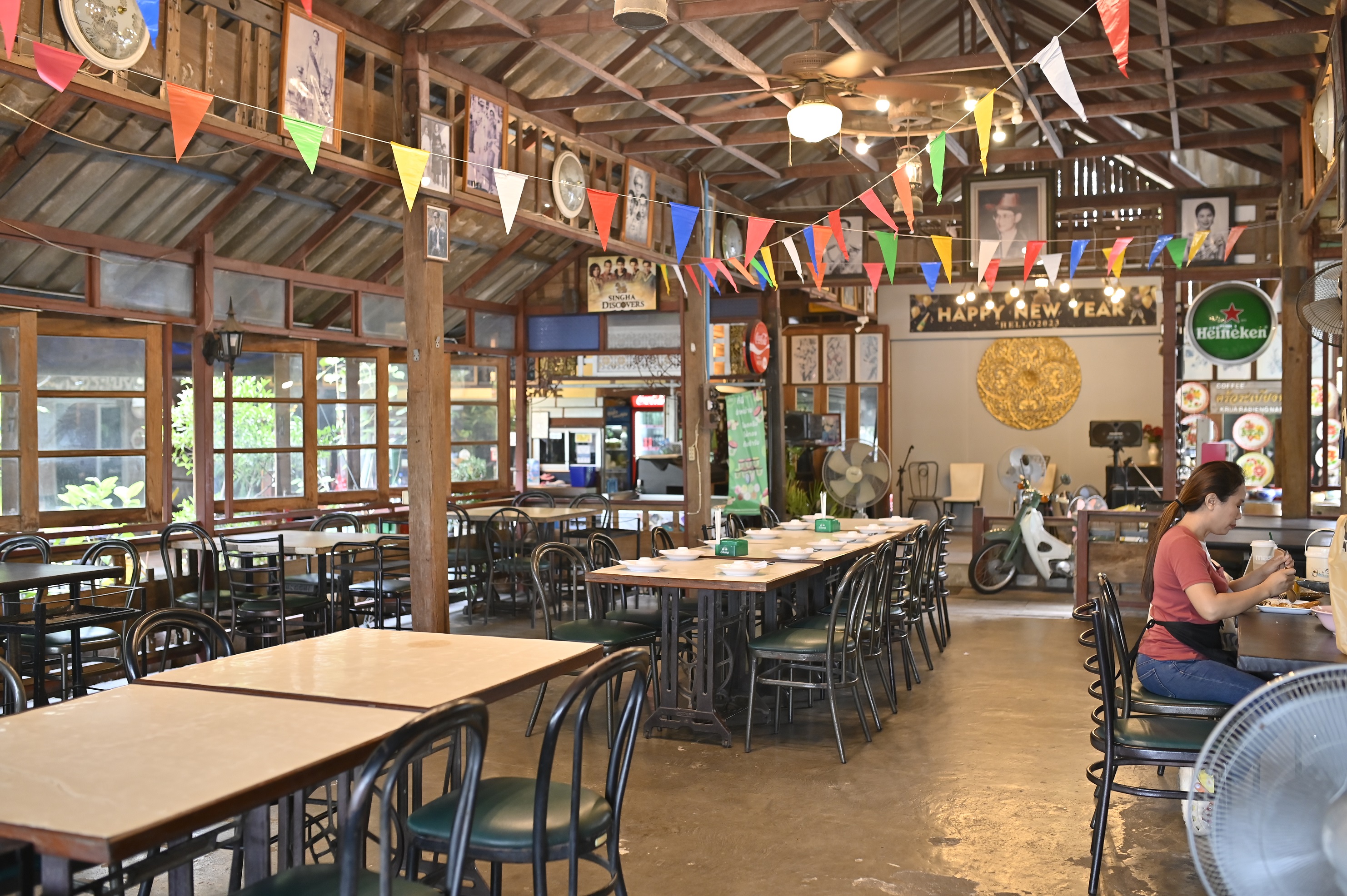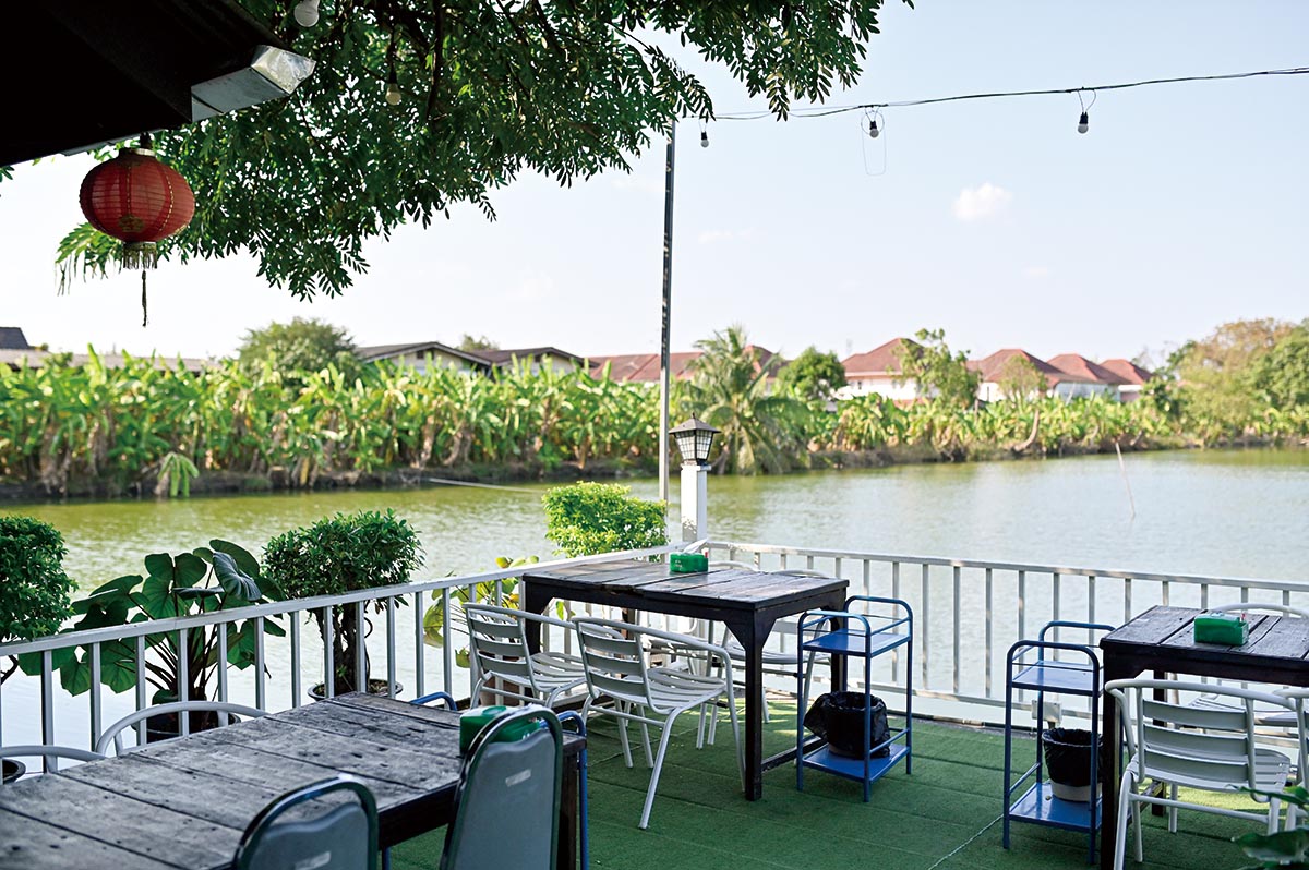 オープンエアの運河沿いの席やレトロな内装の屋根付きエリアのほか、大勢でのパーティも可能なプライベートゾーンまで完備する、なんだかタイの地方都市に来たかのような気分に浸れる木造レストラン。