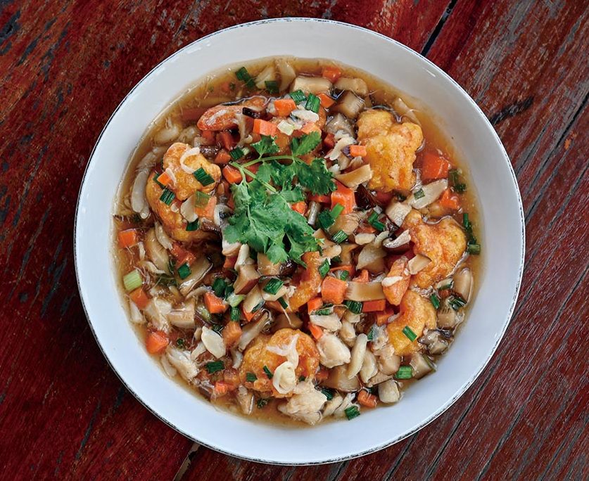 クン・ラートマンプー(159B) 衣を付けて揚げた海老と蟹肉が入ったあんかけスープ。辛くなく食べやすい