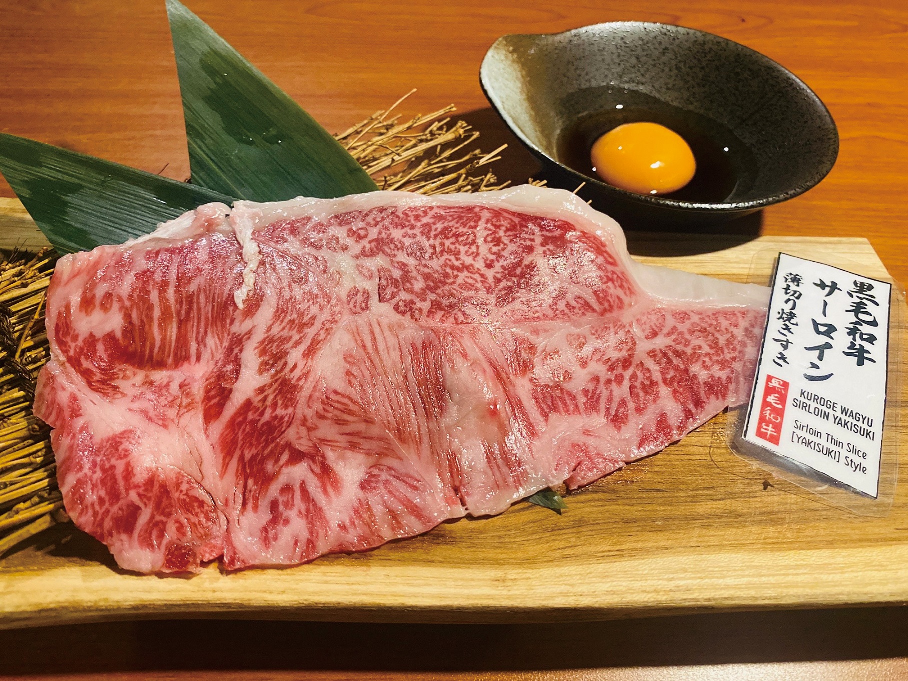 黒毛和牛サーロイン薄切り焼きすき(390B):網の上いっぱいに広がる特大サーロインを、卵を溶いた割下で頂く