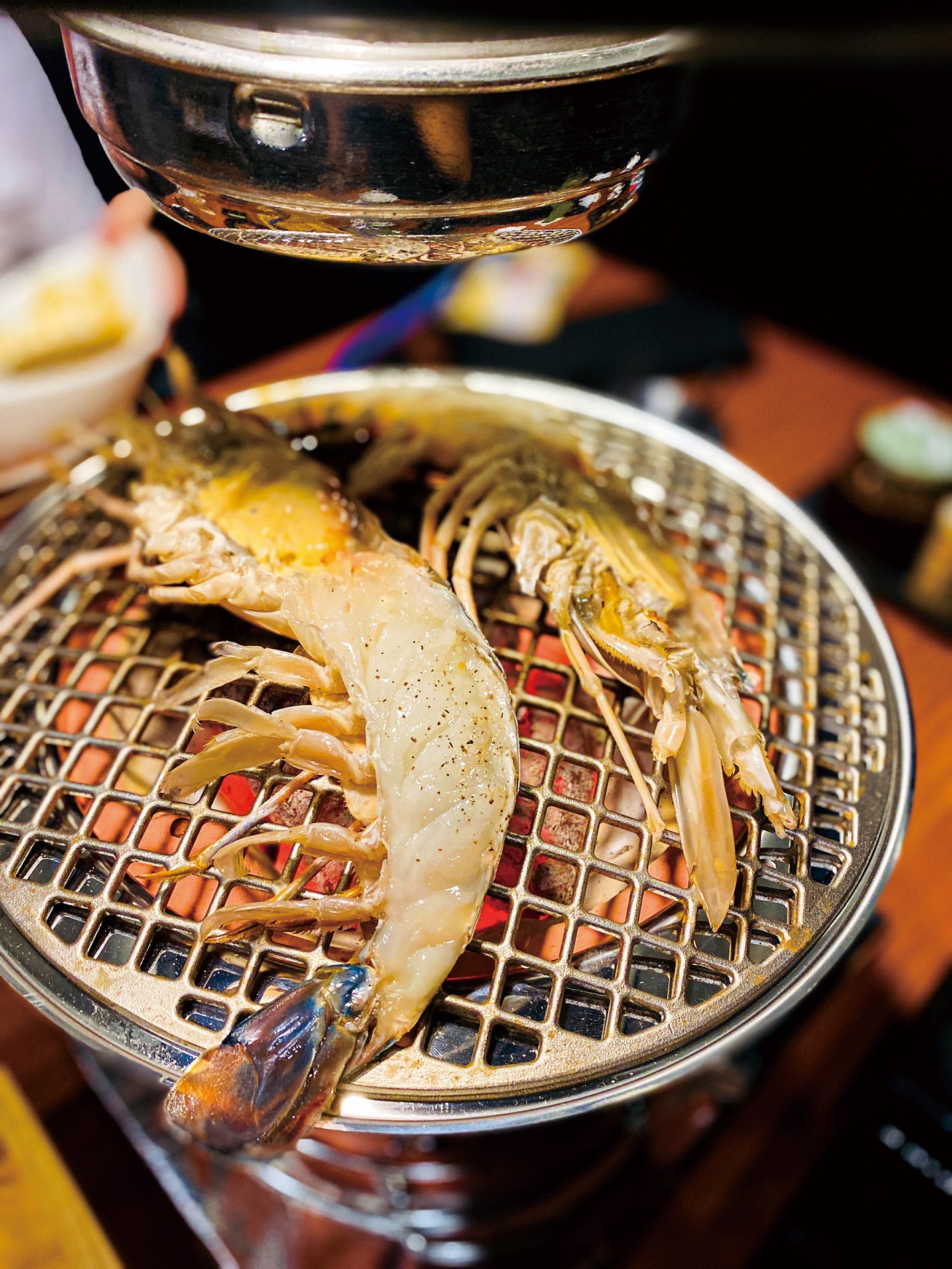 獲れたての魚介類が多く流通するシラチャにいるなら、焼肉と一緒にシーフードも楽しみたいところ。特大焼海老(980B)は焼き上がったその身をすかさずエビ味噌にディップ、そのまま一気呵成にかぶりつこう!