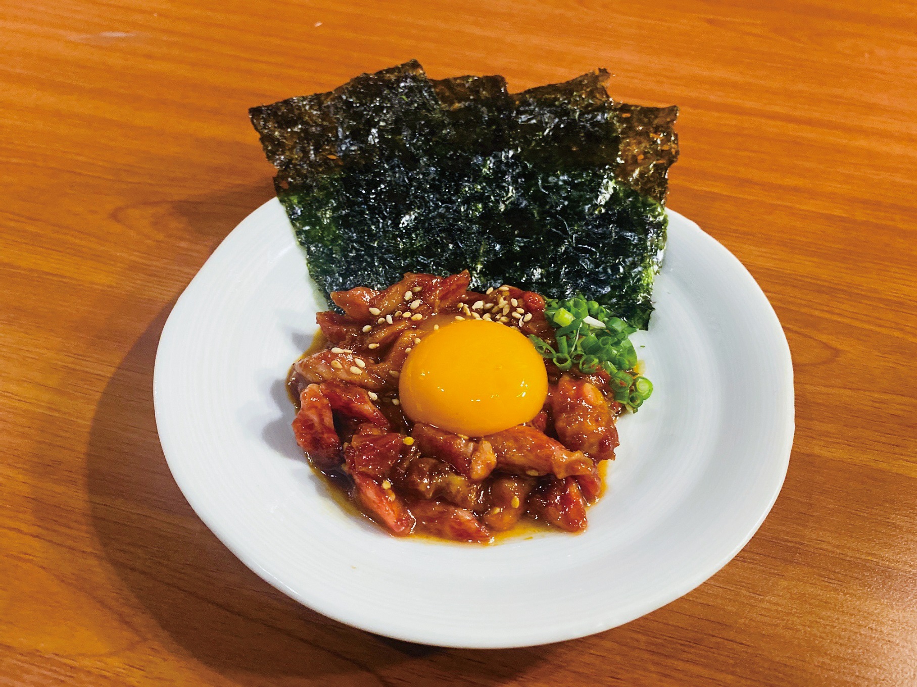 豊富なメニューに迷ったら、薄切り漬けカルビ(99B)とハラミ(99B)で決まり。ひと口食べてわかる肉質と味付けの良さに、これ、本当にこの値段でいいの?といきなり心を鷲づかみに。聞けば肉の味を生かすもみダレも、カルビとハラミでは調合を変えているのだとか。生肉ラヴァ―なら、黒毛和牛細切りユッケ(380B)もぜひご一緒に。鮮度抜群の和牛は口に入れるや舌の上でさらりとほどけて、価格以上の美味を味わえること請け合い。バンコクで大繁盛の隠れ家グループならユッケも安心して注文できます。