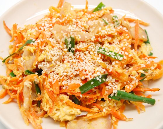人参の千切りの炒め物。スライサーで人参をスリスリする音が由来の1つと言われています。沖縄のお母さんが子どものおやつとして出す料理だが、金城では日本人女性に大人気の一品です。