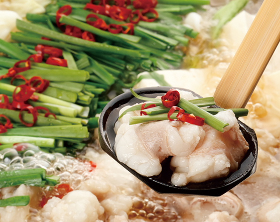 モツとキャベツをふんだんに入れたもつ鍋は、博多の名店うま馬の名物メニュー。新鮮なモツを口に入れると甘みがジュワ〜。スープも最後まで飲み干したくなる美味しさです。