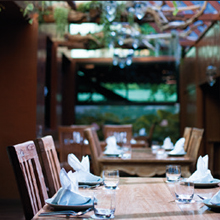 “料理の鉄人” チュムポン氏によるレストラン。築50年の古民家を改装し、ラーマキエンの絵などで飾られたタイらしい雰囲気。夜のメニューは、季節に合わせて料理が変わるコースのみで、古代タイ料理、正統派タイ料理、フュージョンなど 全 5 種 類 。料理に合わせてセラドン焼きやサンカローク焼きの器が使われ、見た目にも美しい。シェフは30人体制というから驚きです。