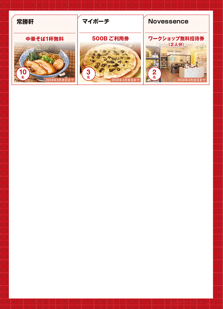 2017.09.29お知らせ 応募者全員に当たる!読者プレゼント Tweet 「バンめし」は、みなさまのおかげで3周年を迎えます。日頃の感謝の気持ちを込めて読者プレゼントを用意しました。応募に際しては読者アンケートにご協力をお願いします。回答内容は「バンめし」の誌面作りに反映させて頂きます。 ※プレゼントの発送先はタイ国内に限ります ※プレゼントの発送は2017年1月中旬の予定です 応募締切:2017年11月15日(水) 応募方法 読者アンケートにお答えください(所要時間約5分) 応募受付は終了しました ↓↓↓プレゼントの詳細はこちら↓↓↓ 最新の投稿 [バンコクの新規開店レストラン] 泰絆拉麺 富田 2025.11.25 多くのレストランが毎日のようにオープンするバンコク。 バンめしがオープンしたて&オープン間近の期待の新店情報を [バンコクの新規開店レストラン] がるしあ 2025.11.25 多くのレストランが毎日のようにオープンするバンコク。 バンめしがオープンしたて&オープン間近の期待の新店情報を [バンコクの新規開店レストラン] はま寿司 2025.11.24 多くのレストランが毎日のようにオープンするバンコク。 バンめしがオープンしたて&オープン間近の期待の新店情報を [バンコクの新規開店レストラン] 挽肉と米 Central Park店 2025.11.24 多くのレストランが毎日のようにオープンするバンコク。 バンめしがオープンしたて&オープン間近の期待の新店情報を [バンコクの新規開店レストラン] 博多焼きもん やまや 2025.11.24 多くのレストランが毎日のようにオープンするバンコク。 バンめしがオープンしたて&オープン間近の期待の新店情報を