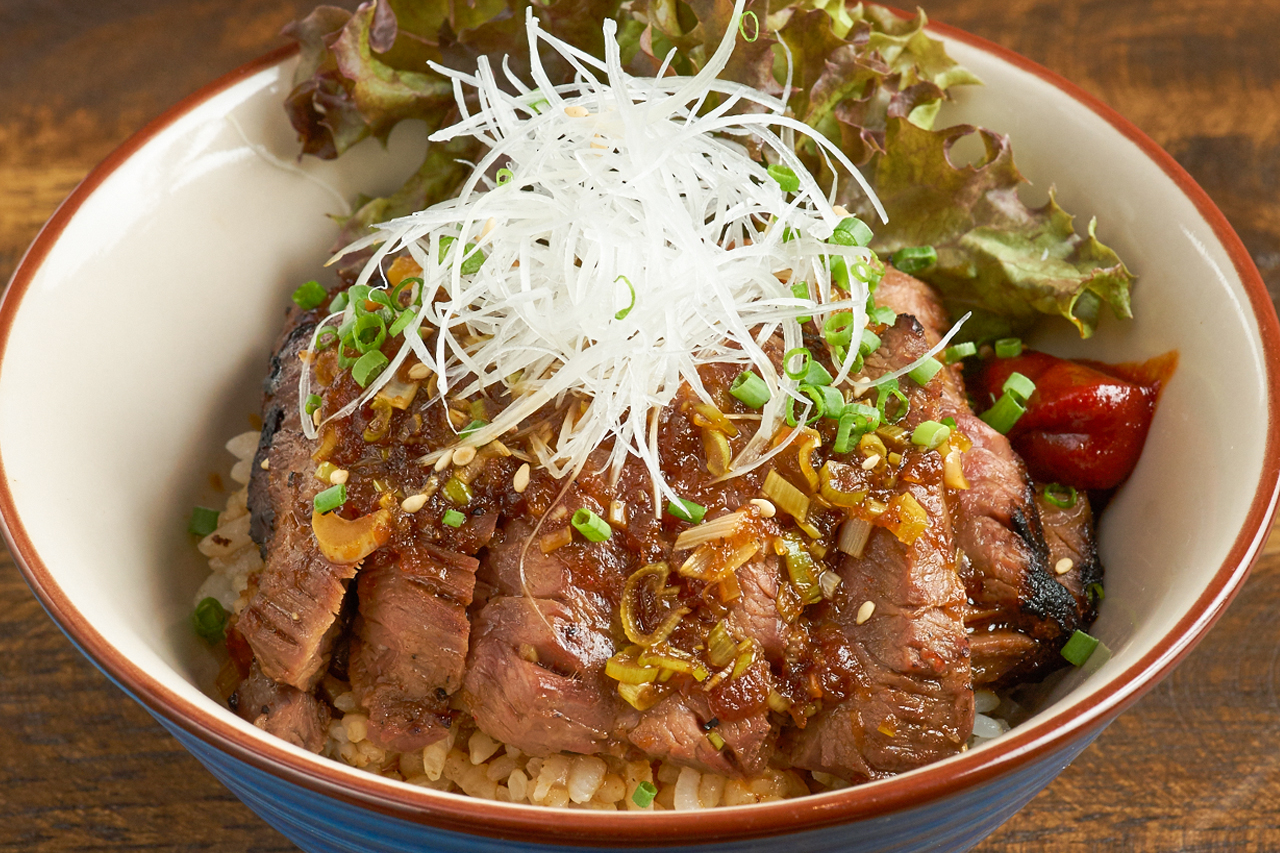 牛ハラミ丼はジューっとあふれる肉汁が食欲を煽り、丼が瞬く間に空に。ワインとの相性も抜群。