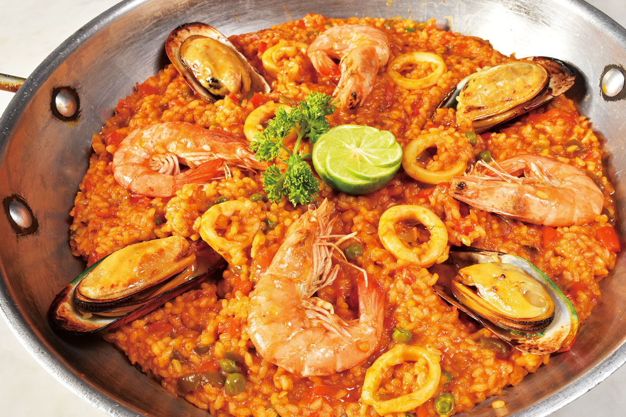 陽気なBGMが流れる店内は、さながらスペインにいるかのよう。シェフの自慢はムール貝やエビなど魚介のダシがたっぷり詰まった「シーフードパエリア」。米の硬さも絶妙で、パエリア好きも納得の一品。