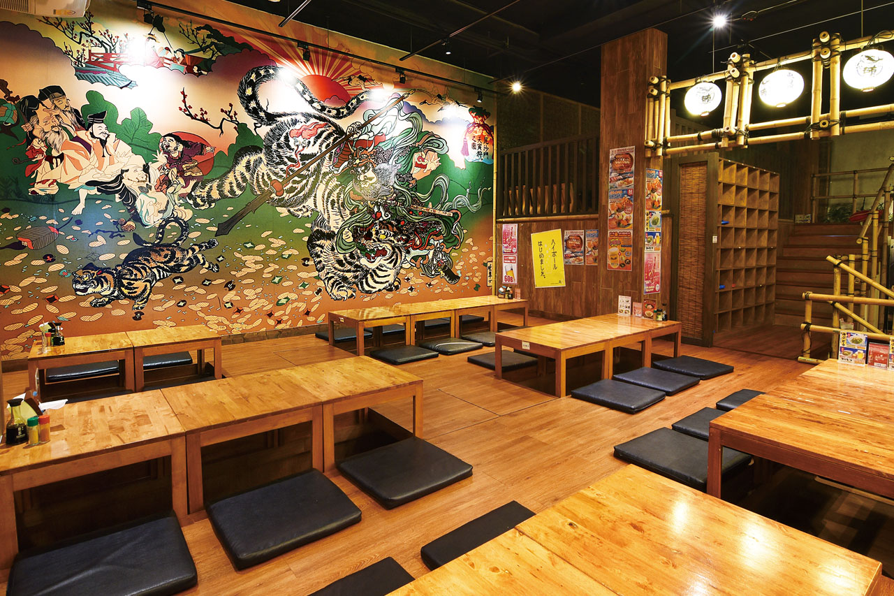 日本村モール入口正面の大箱居酒屋「魚昌」。広々とした店内には、掘りごたつ席、テーブル席、カウンター席があり、お一人様からファミリーまで幅広い客層で常に賑わっている。