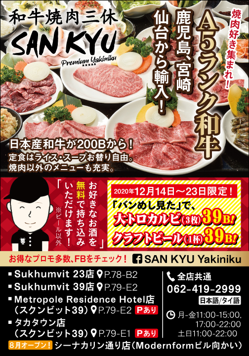 2020.12.17お知らせ バンめしからのお知らせ Tweet バンめし71号(本誌P.3)掲載「和牛焼肉三休 SANKYU」のプロモーションについて誤りがございました。 誤りをお詫び申し上げ、謹んで訂正いたします。 (誤)プロモーション期間 2020年12月13日~22日 (正) プロモーション期間 2020年12月14日~23日 「和牛焼肉三休 SANKYU」の店舗詳細 最新の投稿 [バンコクの新規開店レストラン] 泰絆拉麺 富田 2025.11.25 多くのレストランが毎日のようにオープンするバンコク。 バンめしがオープンしたて&オープン間近の期待の新店情報を [バンコクの新規開店レストラン] がるしあ 2025.11.25 多くのレストランが毎日のようにオープンするバンコク。 バンめしがオープンしたて&オープン間近の期待の新店情報を [バンコクの新規開店レストラン] はま寿司 2025.11.24 多くのレストランが毎日のようにオープンするバンコク。 バンめしがオープンしたて&オープン間近の期待の新店情報を [バンコクの新規開店レストラン] 挽肉と米 Central Park店 2025.11.24 多くのレストランが毎日のようにオープンするバンコク。 バンめしがオープンしたて&オープン間近の期待の新店情報を [バンコクの新規開店レストラン] 博多焼きもん やまや 2025.11.24 多くのレストランが毎日のようにオープンするバンコク。 バンめしがオープンしたて&オープン間近の期待の新店情報を