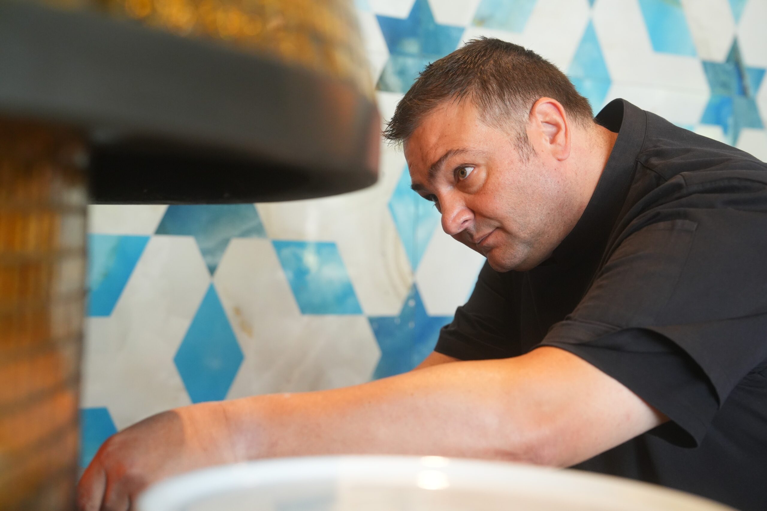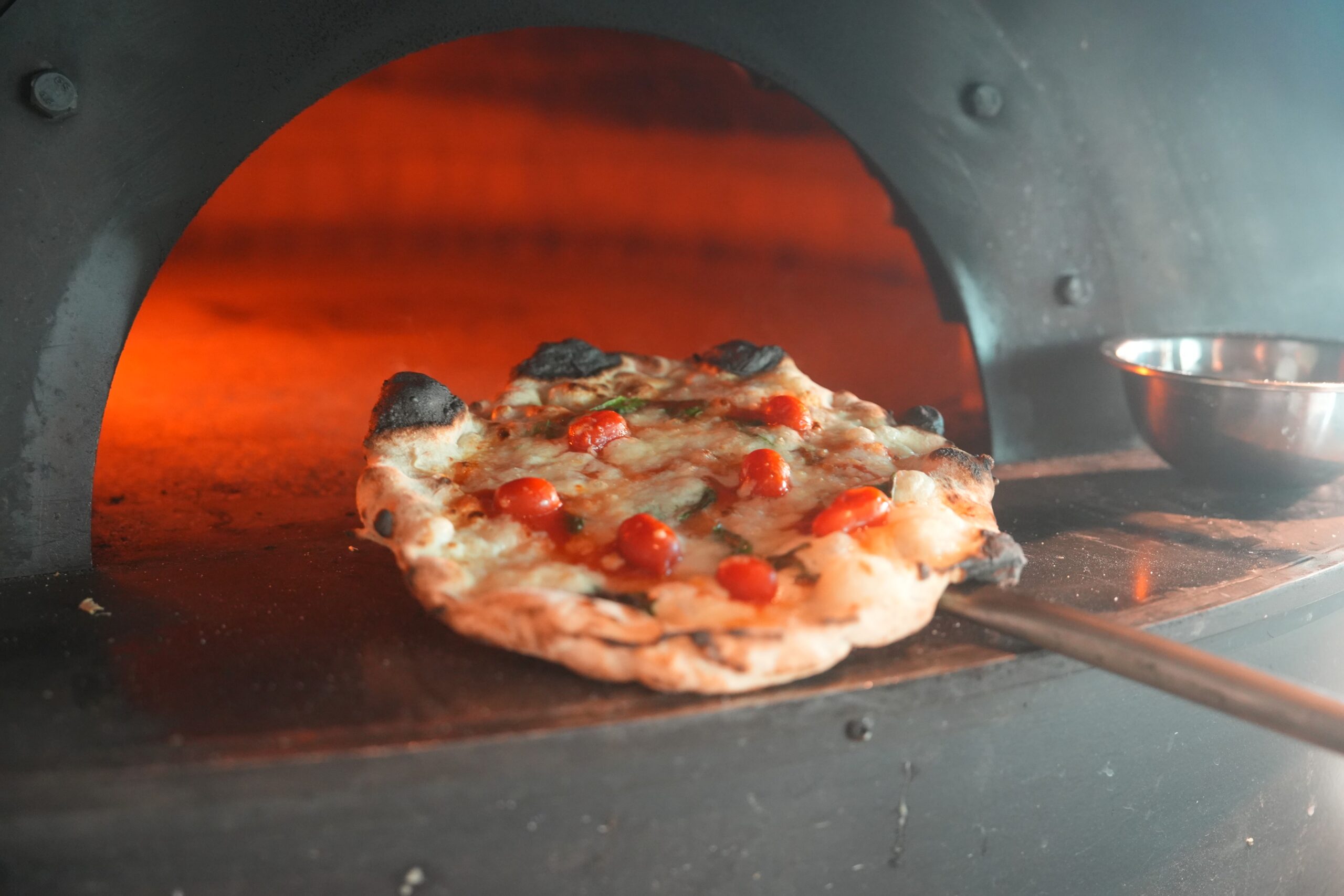 店の入り口で存 在 感を放つ、オーナー自らが設計したこだわりの薪窯。特徴的な縁を壊さないよう、巧みな技術で焼き上げる