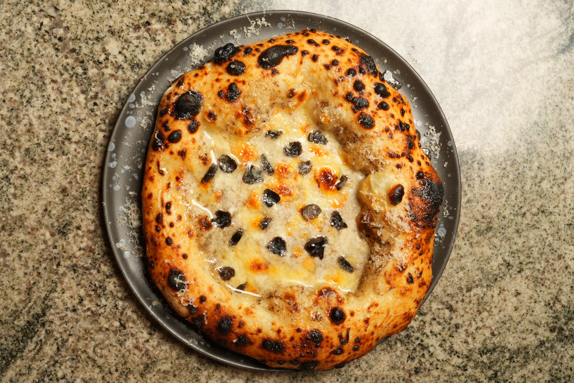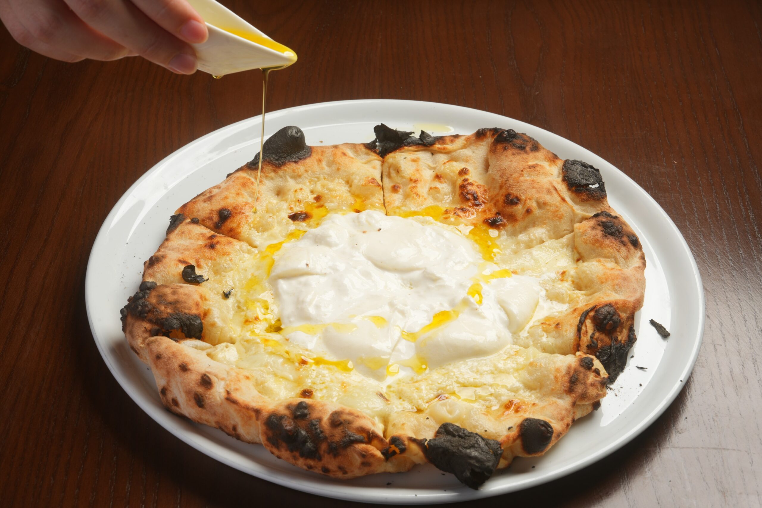 ブッラータチーズが主役の一枚。チーズピザ特有の重たさを感じさせない新感覚の味わい。仕上げに白トリュフオイルを添えて