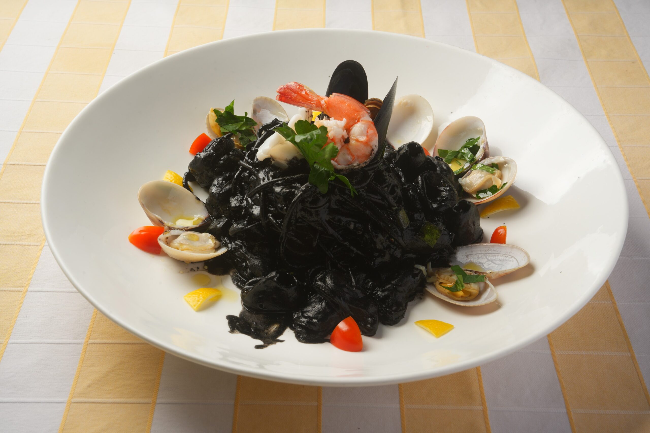 ピザ以外のメニューも充実。中でも弾力感あるシーフードがたっぷり使用されたイカ墨パスタは、日本人からも人気が高い一品