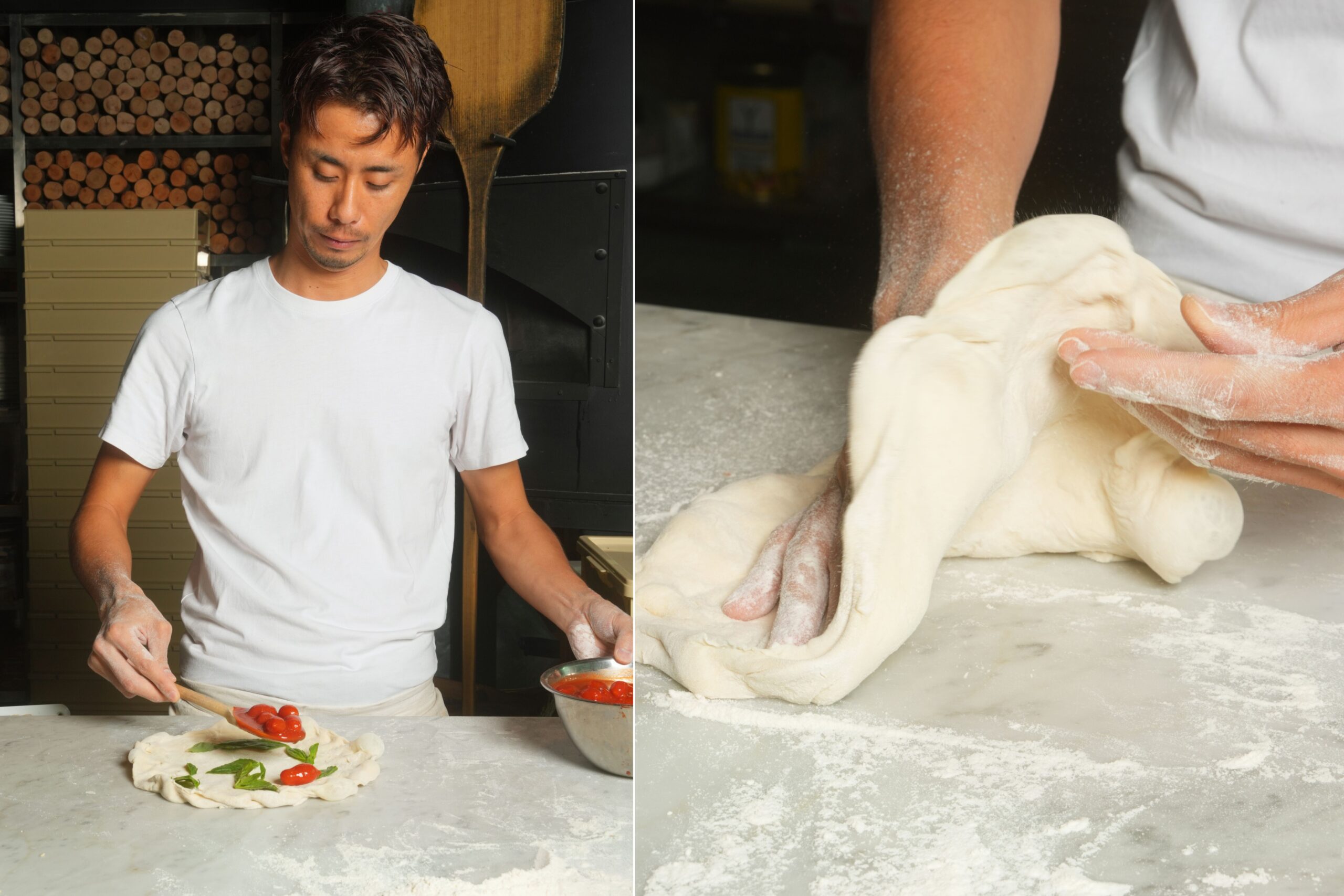 日本で挽いた独自ブレンドの小麦粉で30時間発酵させた生地。縁に気泡を含ませながら成形していく匠な職人技はまさに圧巻