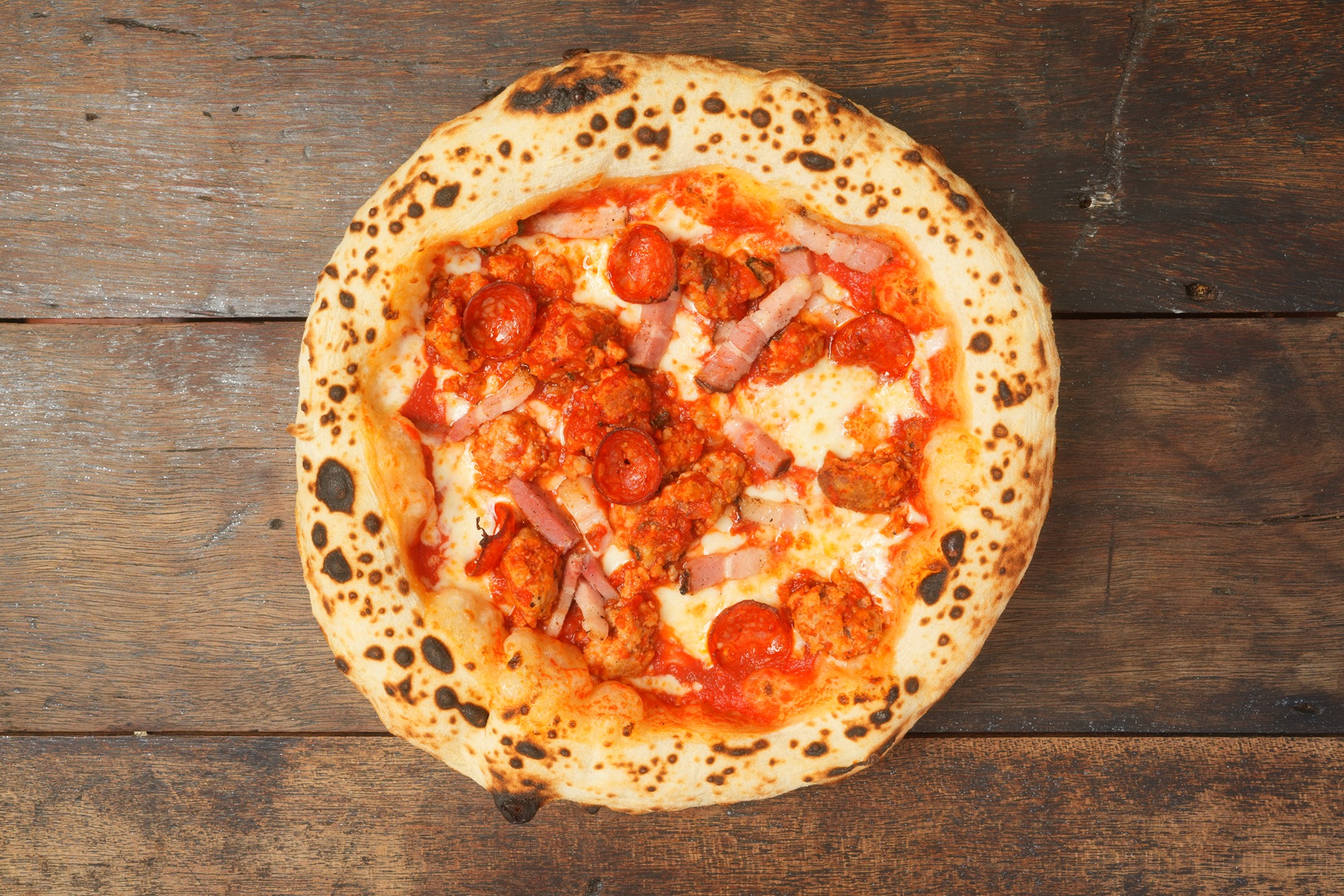 ミートボールを贅沢にトッピングした看板ピザ。肉の旨味とトマトソースが爽やかに調和する