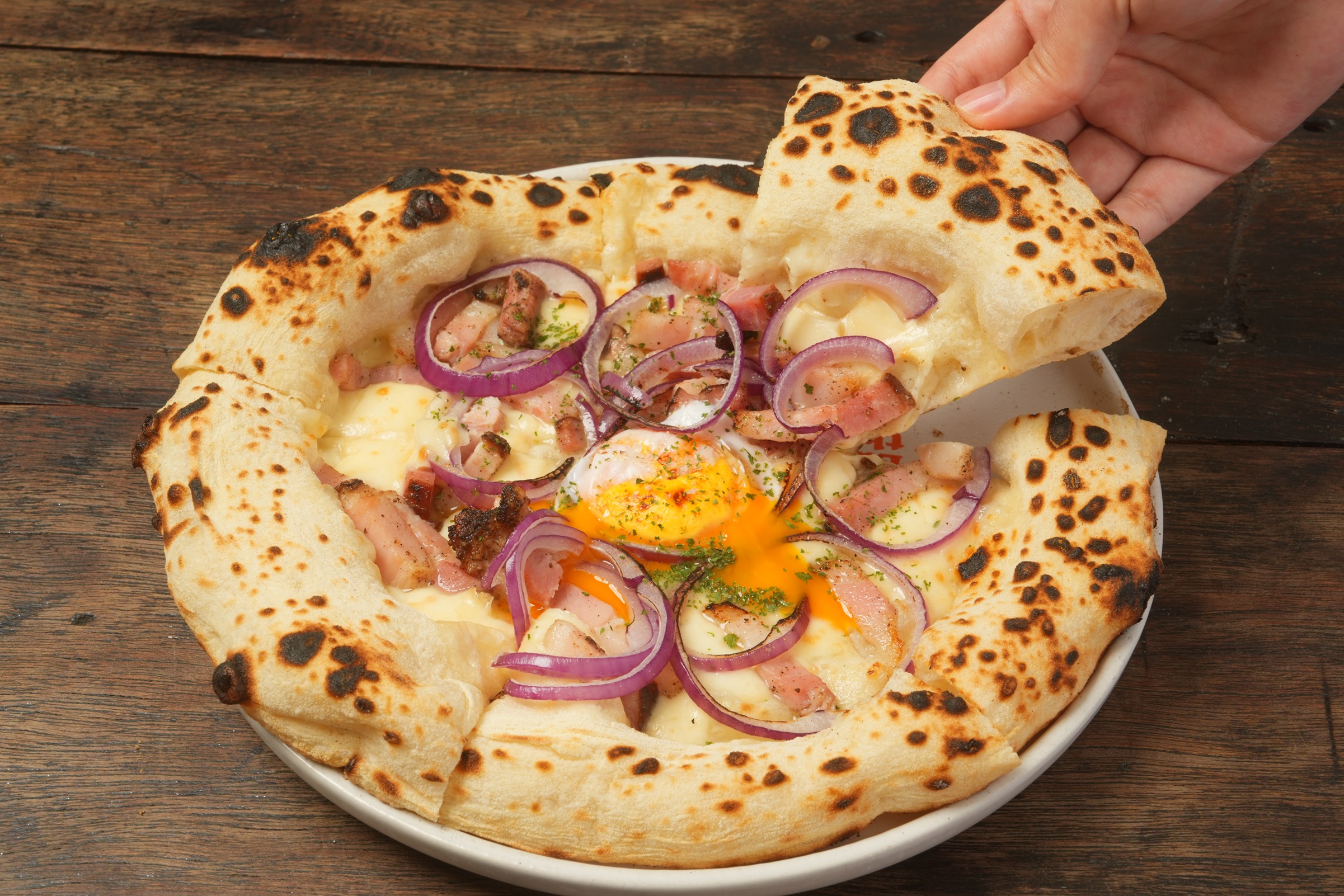 チーズと卵黄が濃厚に絡み合うリッチな一枚。スモークベーコンの豊かな香りと旨味が、より奥行きある味わいへと引き上げる