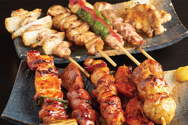 焼き鳥おまかせ10種盛り(250B)新鮮な鶏を仕入れた日に手で刺して、炭でジューシーに焼き上げます。