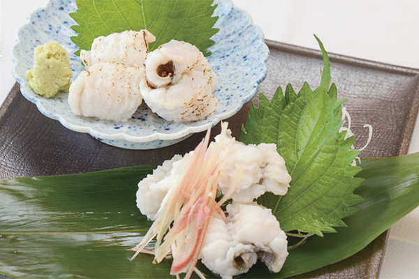鱧の刺身、おとしと炙り(450B) ※入荷状況を事前にお問い合わせください。鮮度よいときだけ提供される限定メニュー。鱧しゃぶなど他の鱧料理もあります。