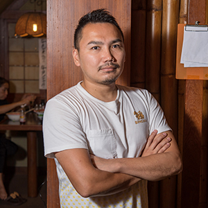 祖父は京都一のマグロ問屋、父は祇園で寿司店を営む料理人一家で育ちました。のちに両親はトルコへ、僕は親元を離れてイギリスへ留学。高校卒業後は、やはり親の商売を継ぎたいと、大阪北新地の割烹で修行を始めました。掃除接客、盛り付けまで何でもやらされましたが、そこで料理の基礎が身につきました。 その後、料理の鉄人・中村孝明氏の店「孝明ARIAKE」の料理人に抜擢された時は嬉しかったですね。ですが、周りは優秀な料理人ばかりで競争も厳しい。しかも創作和食の店なので、和食出身の僕はメニューの意味さえ分からない。しかし「ここで生き延びてやる!」という一心で、学んだ事はすぐにメモして、寮に帰ればノートにまとめ、同僚と切磋琢磨し努力を重ねていきました。 2002年に両親はトルコ、僕は日本からタイに渡って「大の樹」をオープン。父が寿司、自分は料理と、親子で店を開く夢がタイで結実しました。親孝行できている今が一番幸せですね。