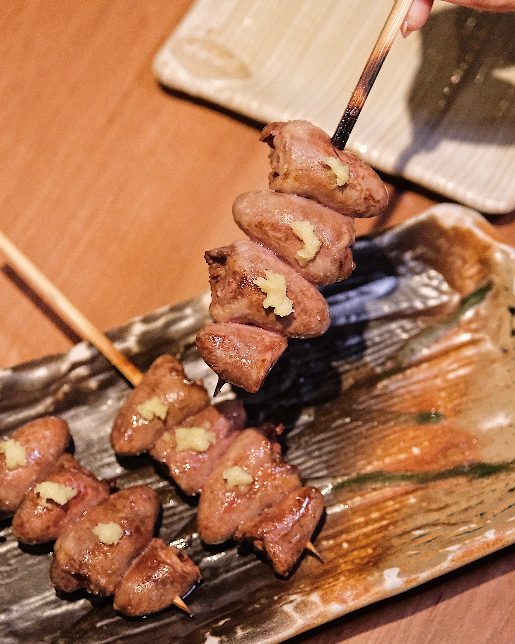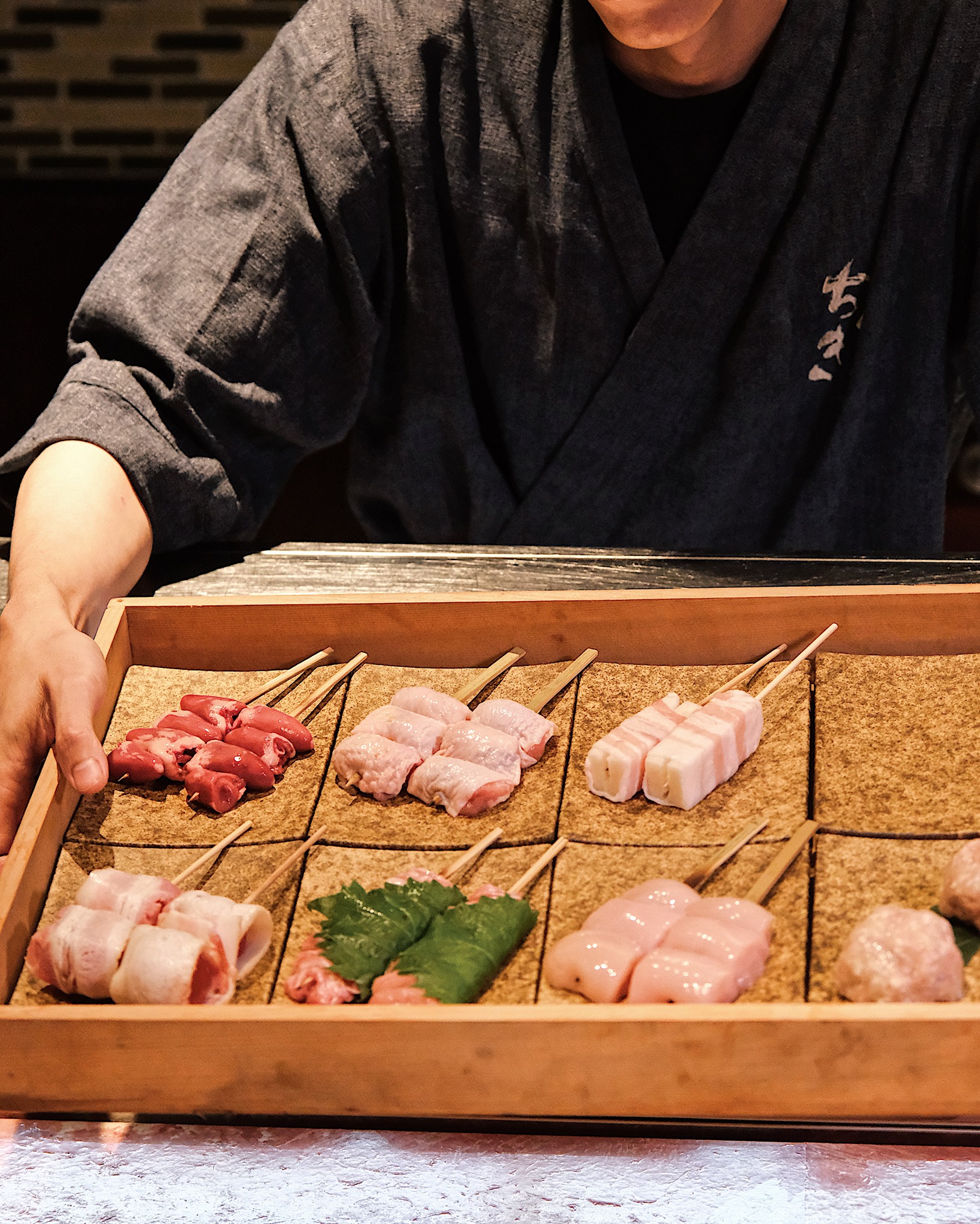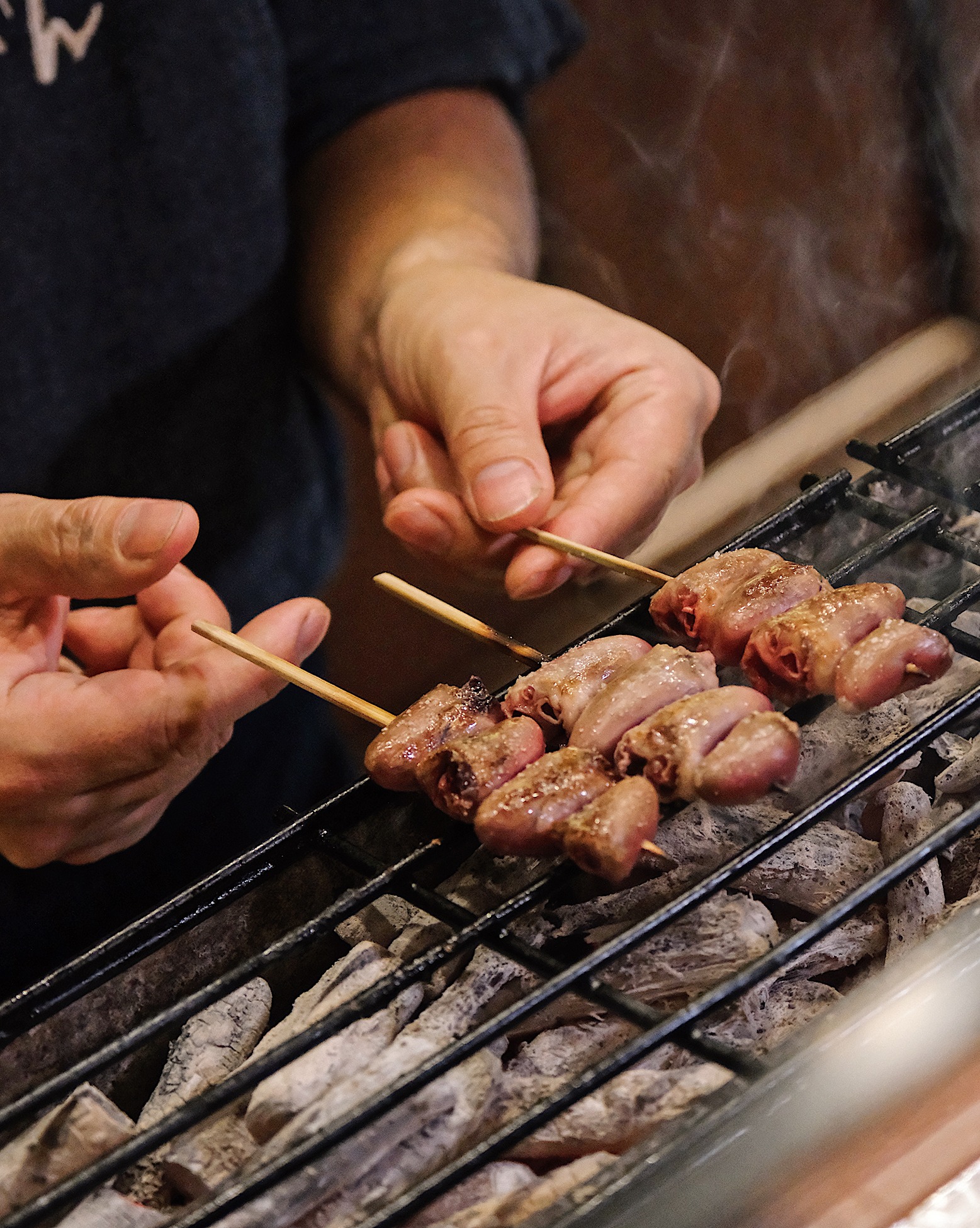 焼き鳥の命ともいえる火入れには、古来より重宝される伝統の「備長炭」を使用。炭の密度、タイ特有の湿度、そして空気の流動と、日々変化する環境下で常に均一なクオリティーを提供すべく、職人は五感を研ぎ澄ませて火を操る。焼き過ぎればジューシーさが失われ、足りなければ素材の魅力は引き出せない。客の口に運ばれる瞬間に最高潮を迎えるよう、余熱による火の通りまで計算し尽くすその姿は、まさに長年の職人技だ。