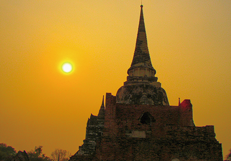 もう1か所、個人的にお薦めしたいのが、14~18世紀のアユタヤ王朝時代からある古い寺院、ワット・サケット(黄金の丘)です。“サケット”は王室用語で「王様の散髪」という意味で、現チャクリー王朝のラーマ1世となったチャオプラヤー・チャクリーが、この寺院で散髪してから即位式に臨んだことからこの名前が付いたそうです。344段のらせん階段を上り、黄金の丘の上にたどり着くと、市街の絶景を目にすることができます。そして満月の下、ここで行われるマカーブーチャーの儀式は、まさに荘厳そのものです。ぜひ一度、足を運んでみて下さい。