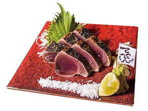 鰹わら焼き(400B~)は、柑橘酢をかける「土佐造り」、おなじみ「昔ポン酢」、岩塩の「焼き斬り」から、好みの食べ方を選べます。土佐の地酒「美丈夫」と一緒にどうぞ。