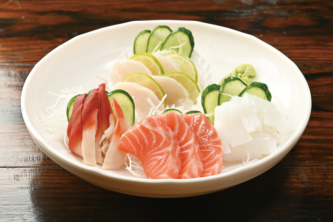北海道産ホタテ、宮城県産ほっき貝など、魚介も良いものが揃う(写真は4点盛り320B)