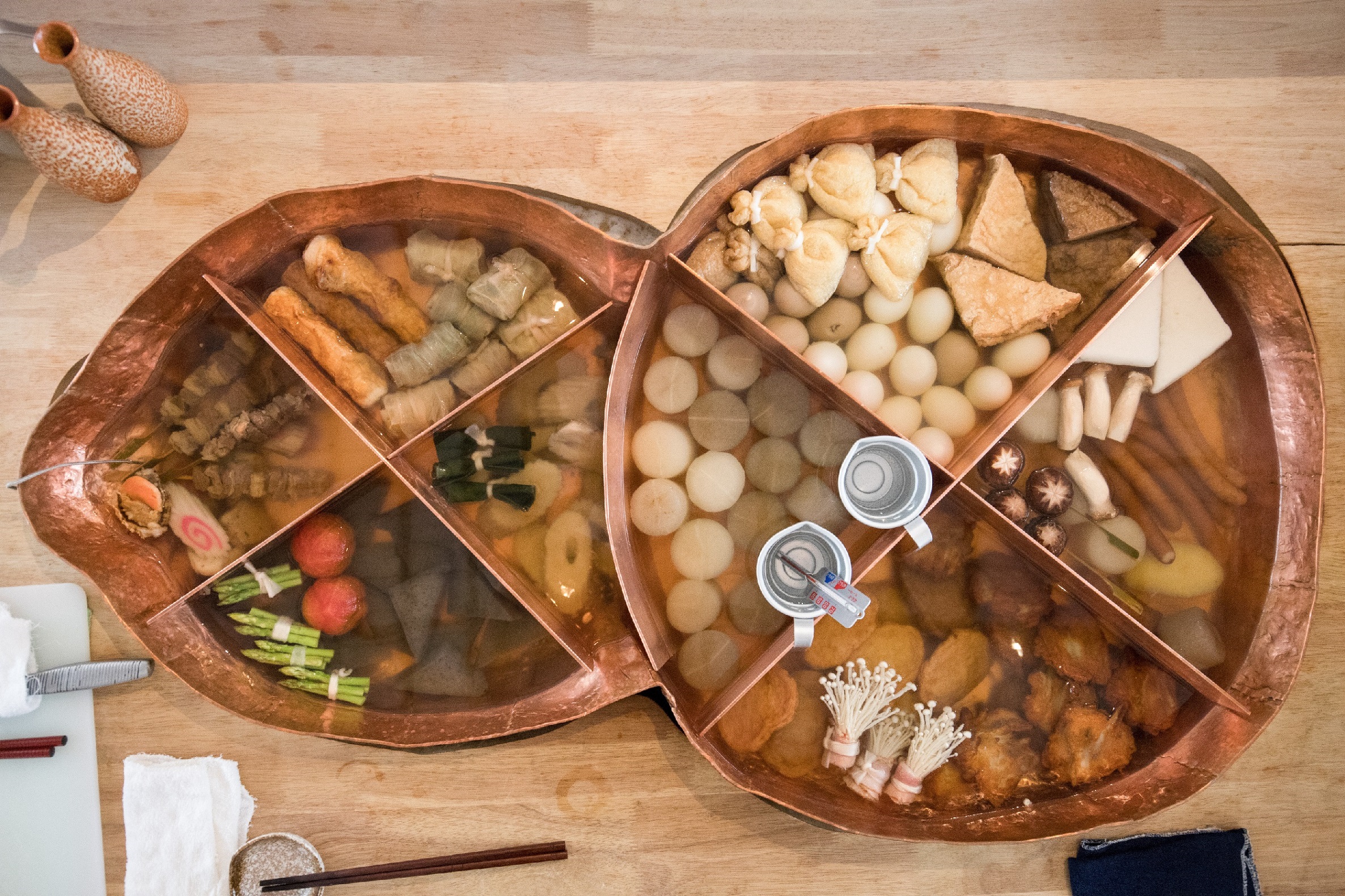特注の大きなひょうたん型の鍋。深い旨みをたたえたおでんは一品50B~