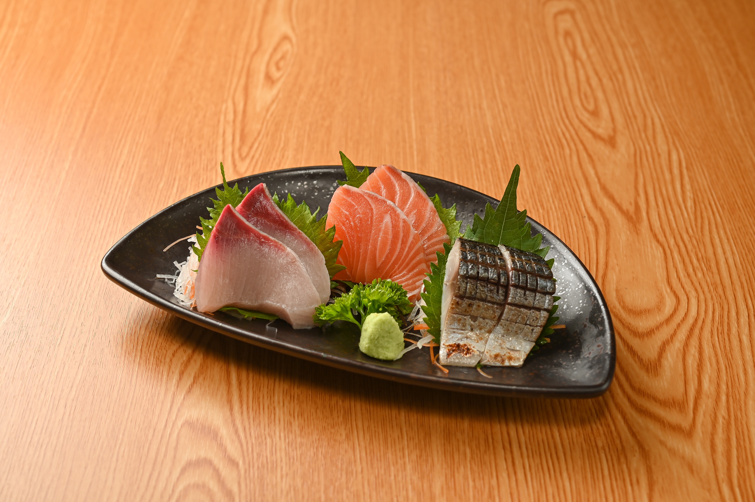 日本直送の鮮魚も自慢。厚めに切りつけた身に大満足!な日替わり3種盛りは、季節に応じて内容が変わる