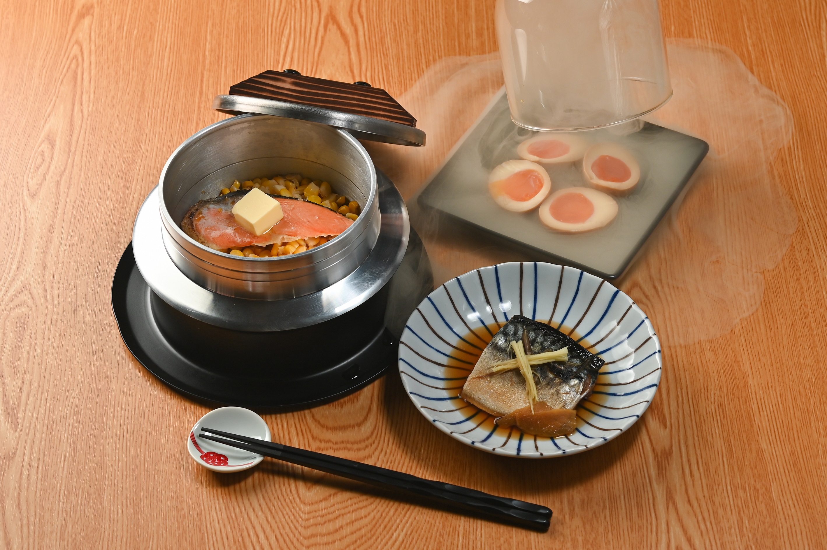 注文を受けてから炊く人気の炊き込みご飯、なかでも玉蜀黍と鮭のバター風味炊き込みご飯(280B)は、食べ終わるのが名残惜しいほど