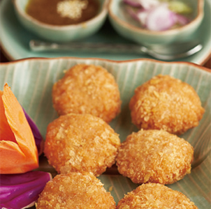 トート・マン・クン エビのすり身にナンプラーやタイハーブを練りこんで揚げたもの。スイートチリソースをつけて食べる、初心者 向けメニュー。魚のすり身を使う トート・マン・プラー も美味だが、たまに激辛のもあるので要注意。2回目以降