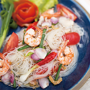 ヤム・ウンセン おなじみの青パパイヤサラダ、ソムタム と人気を二分するのが、春雨をシーフードや豚肉と和えたスパイシーなサ ラダ。春雨にナンプラーとライムのタレがしみこみ絶妙なおいしさに。結構辛いので、苦手な人は一言伝えて。2回目以降