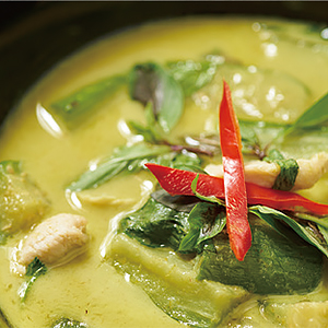 ゲーン・キアオワーン キアオ(緑)ワーン(甘い)の名の通り、緑色の唐辛子ペーストを使ったグリーンカレーで、比較的マイルドな味の部類。具材のグリーンピースのようなスズメナスは少し苦い。ジャスミンライスにかけて食べるのがおすすめ。2回目以降